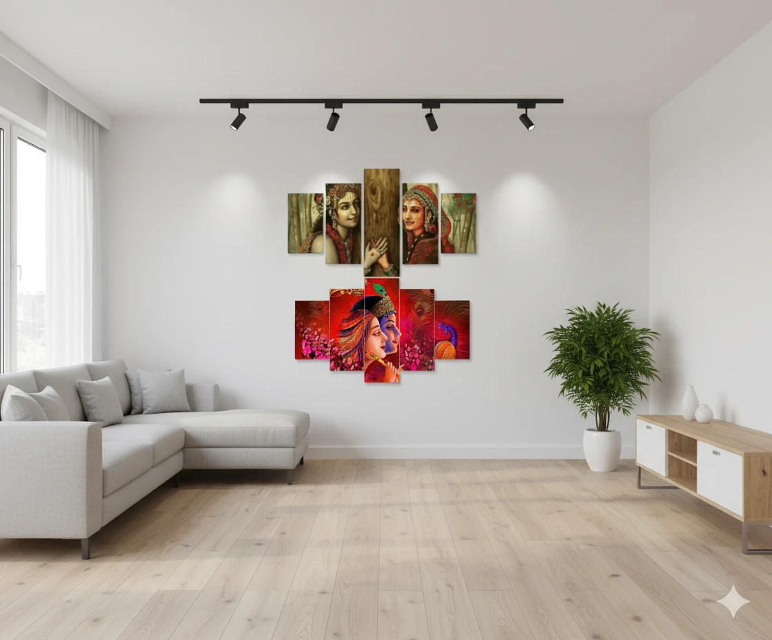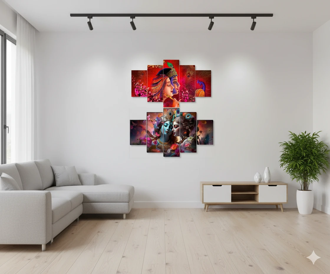 Radha Krishna Wall Art Set, 5 Panel Canvas Painting, Red and Gold, Decorative Peacock Theme