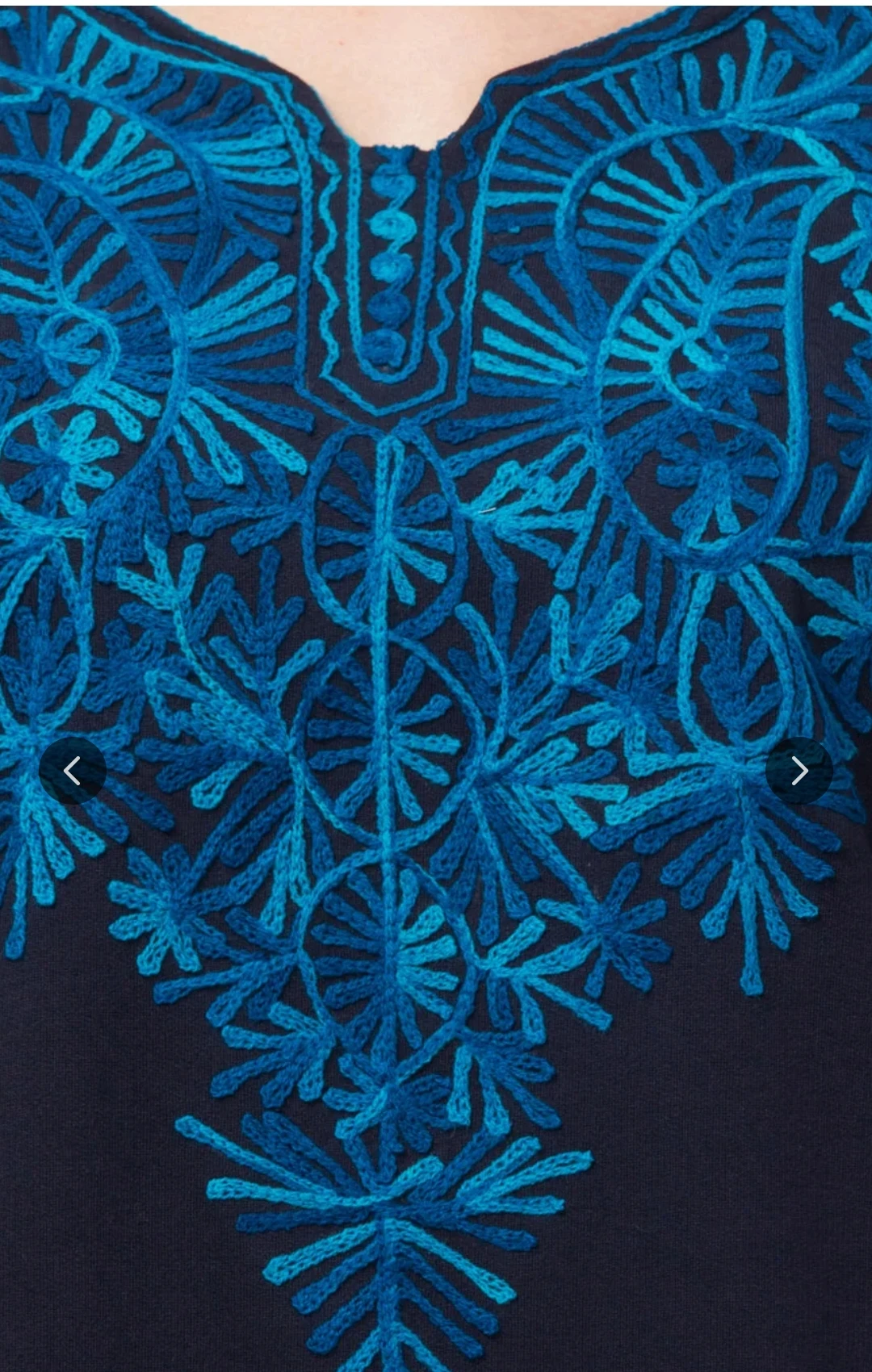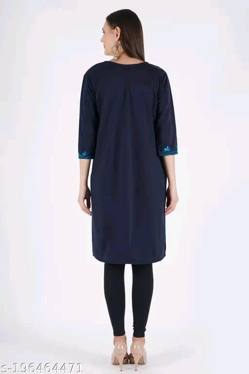 Embrace refined tradition with this navy blue kurti, beautifully accented with bright blue floral embroidery. Featuring a graceful V-neckline and three-quarter sleeves, the embroidery highlights the neckline, cuffs, and hemline for a cohesive and elegant look. Paired with sleek black leggings and beige high-heeled shoes, this outfit is perfect for festive occasions, cultural events, or stylish everyday wear. The ensemble is completed with statement dangling earrings, adding a touch of glamour to its ethnic charm.