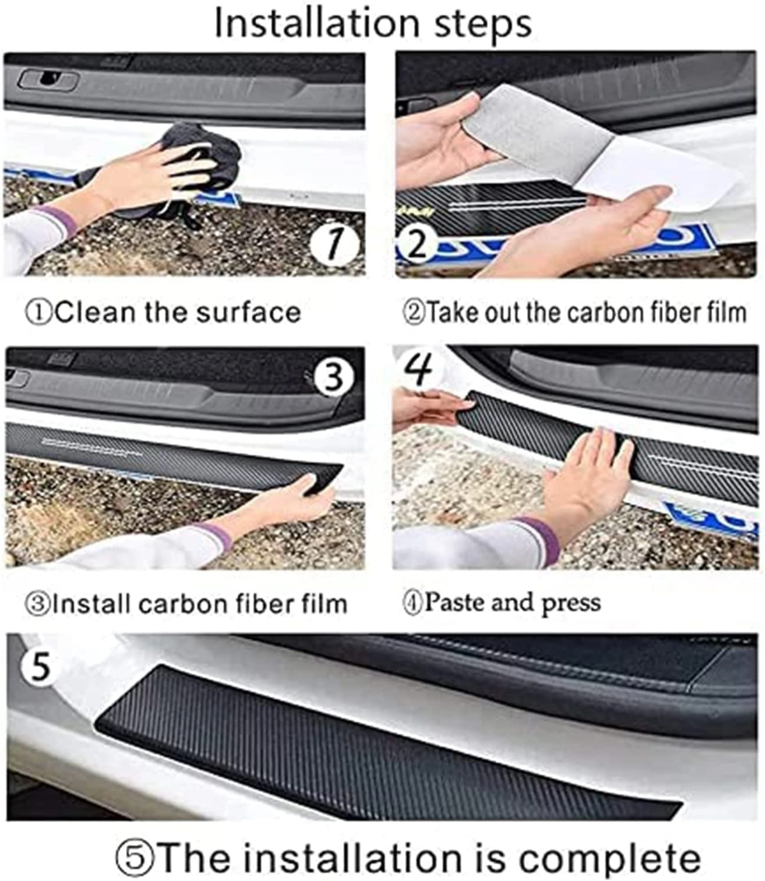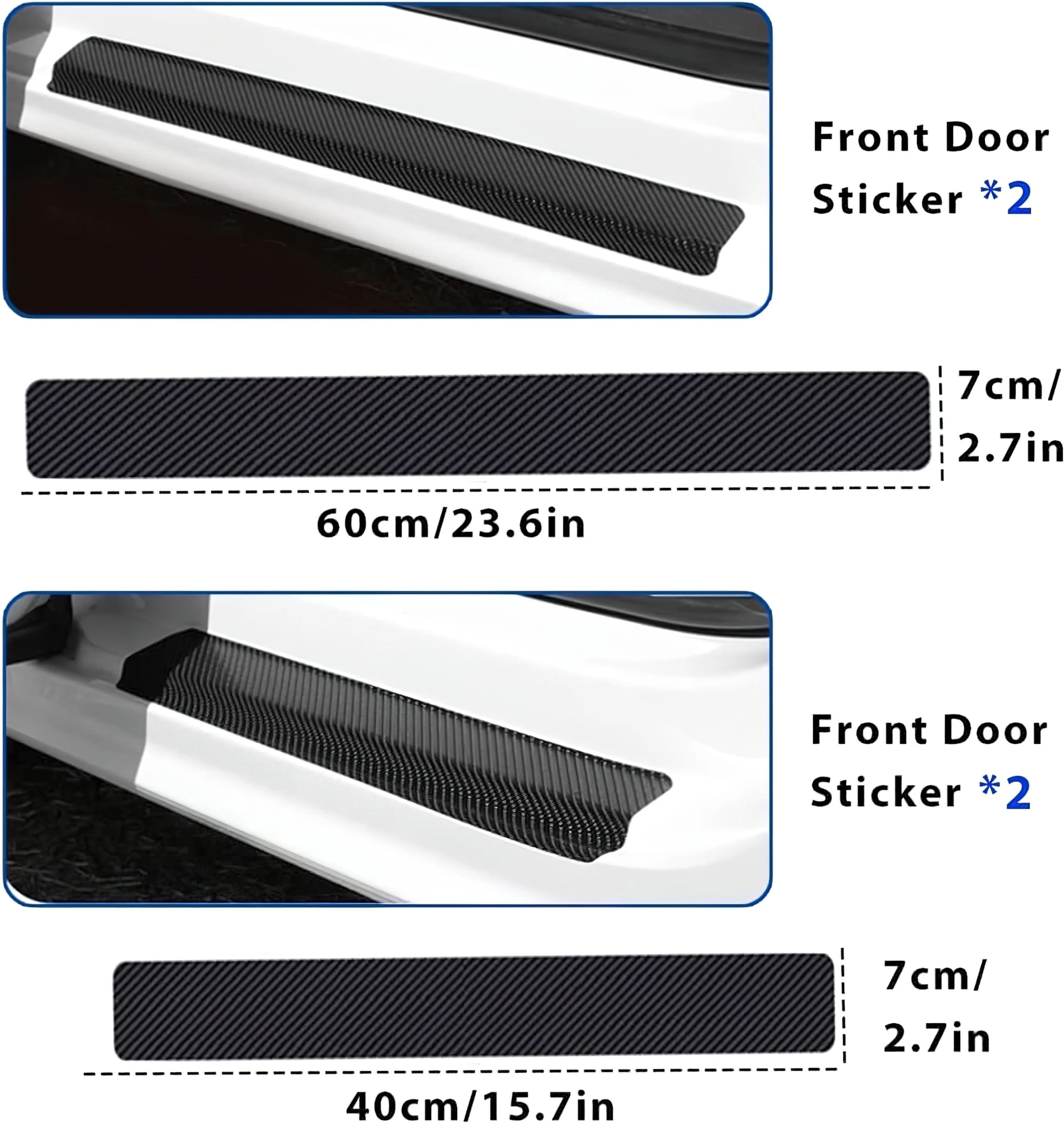 Universal Car Accessory: An essential part of car accessories all new stylish, this Universal 4 Pcs Car Door Sill Protector is a must-have car accessory. It's suitable for any car, offering a sleek black vinyl finish that complements any vehicle's interior or exterior. Anti-Scratch Tape for Car: This Car Door Sill Protector doubles as an anti scratch tape for car, providing extra protection against scuffs and scratches. Made of durable carbon fiber tape, it ensures your car remains in pristine condition. Carbon fiber Wrap: This car door sill protector is not just a practical accessory, it's also a car decoration. The carbon fiber wrap adds a stylish touch to your car interior decoration accessories, enhancing the look of your vehicle. Car Protection: Our car door sill protector offers essential car protection accessories. It acts as a barrier against scratches, ensuring your car's door sill remains unscathed. It's an ideal part of car accessories interior all new stylish. Easy Installation: This car door sill protector is easy to install. Simply clean the surface, peel off the backing of the carbon fiber wrap, and apply it. Perfect for car enthusiasts looking for car modification accessories or car exterior accessories.
