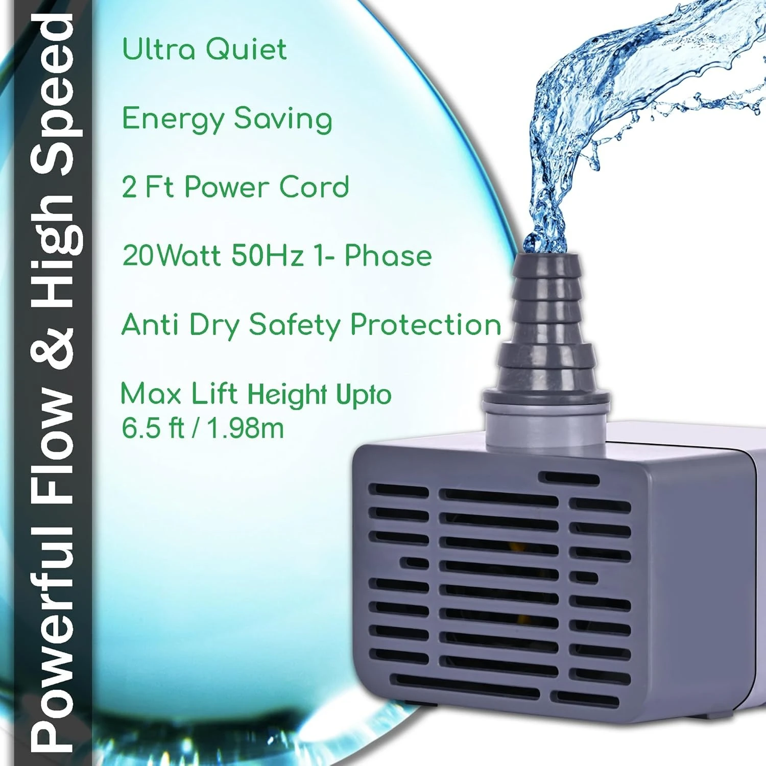 ▶STRONG POWER AND HIGH LIFT - Gives you a true flow rate of 1250 LPH ( at zero height ) and a water lift of 1.98m/6.5 Feet, 20W High-Quality Motor for energy saving. Lift height is the max height the water goes up, after connecting the water pipe to the nozzle (Make sure the joint is sealed securely and tightly), NOTE - Please check the water lifting height before making a purchase.