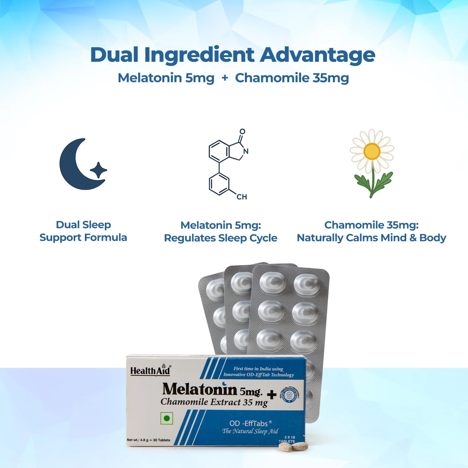 Unlock the secret to deep, restorative sleep with HealthAid's Melatonin and Chamomile sleep supplement. Embrace the powerful combination of melatonin and chamomile, two sleep enhancers that promote relaxation and enhance deep sleep quality. Our sleep health supplements for women and men are scientifically designed to help you drift off quickly and enjoy uninterrupted restful sleep, so you wake up feeling rejuvenated and full of energy.