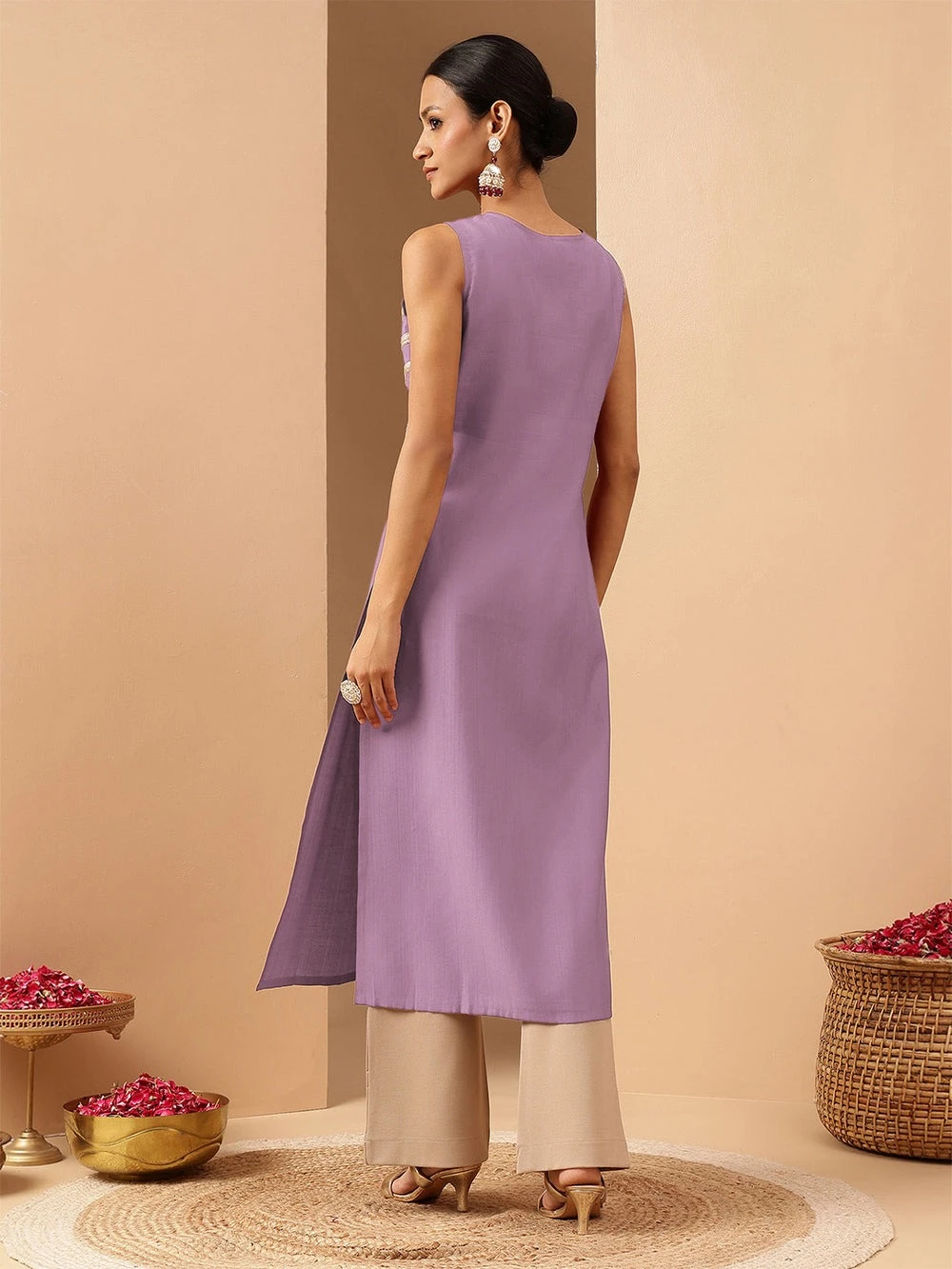 Make a bold yet elegant statement with this stunning sleeveless silk blend lavender straight kurta from janasya. The straight-fit kurta features intricate zari work, sequin detailing, and beautifully placed lace accents that add a touch of festive sparkle. The rich design on the front enhances its graceful charm, while the below-knee length makes it perfect for both casual and semi-formal occasions. Ideal for warm-weather celebrations or layered festive looks, this single-piece kurta blends tradition with modern flair. Style it with palazzos or straight pants and let the intricate embellishments speak for themselves.