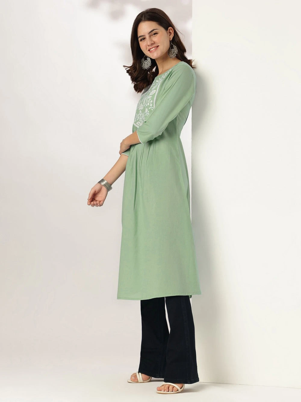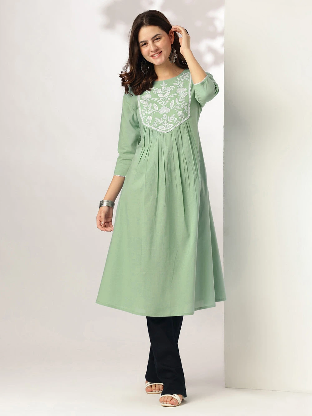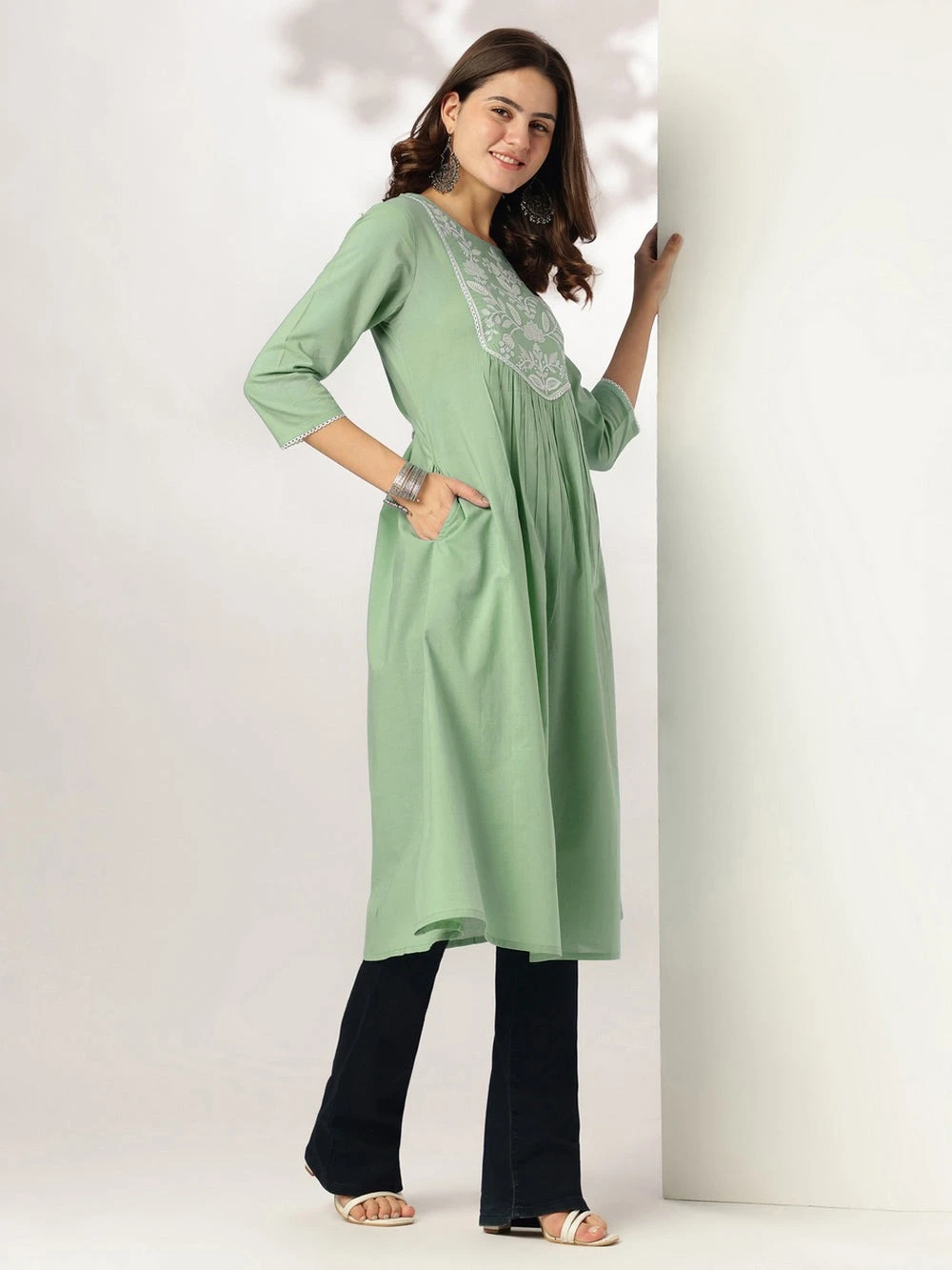 Elevate your everyday ethnic wardrobe with this pure cotton light green a-line kurta crafted for ultimate comfort. The kurta features delicate embroidery on the yoke, accentuated with cotton lace detailing along the neckline and sleeve hemlines, adding a touch of elegance. Designed with a gathered silhouette below the yoke with a side pocket, it ensures a graceful fall and easy movement. The 3/4th sleeves and breathable fabric make it perfect for all-day wear during warmer months.