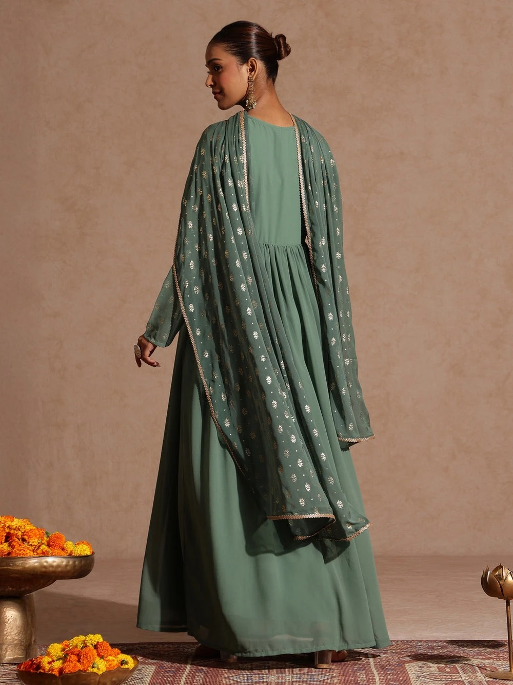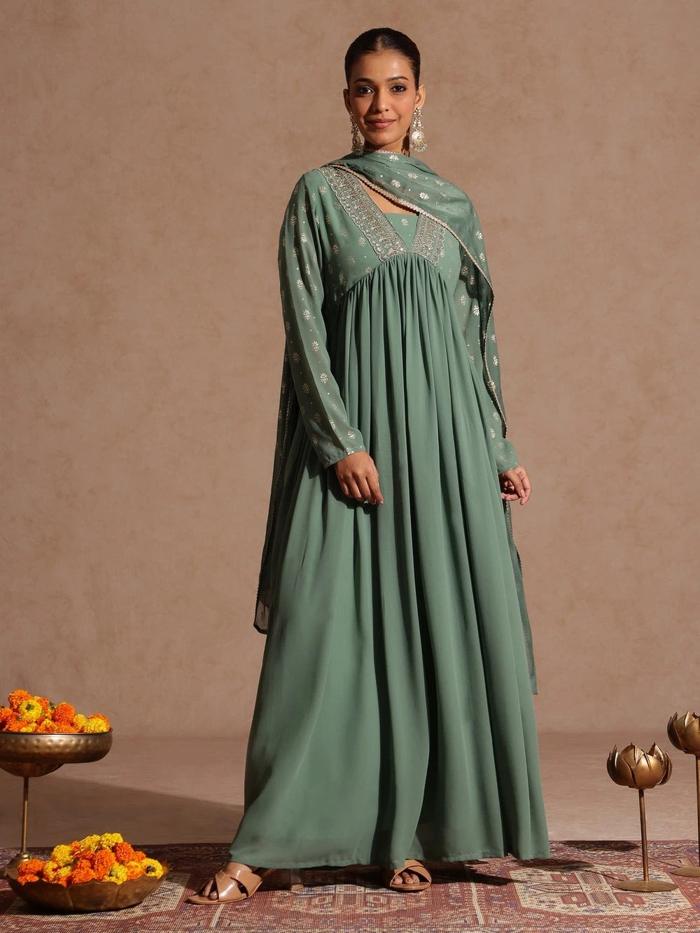 Make a statement at any festive gathering with this stunning sage green a-line kurta and dupatta set from Janasya. Crafted in weightless georgette, the floor-length a-line silhouette features delicate gathers and butter crepe lining for a graceful flow. The yoke is adorned with intricate golden zari work and shimmering foil prints, adding a festive sparkle. Designed with a flattering v-neckline and full sleeves with button closure, it offers both comfort and sophistication. The outfit is paired with a matching chiffon sage green dupatta, adorned with golden foil prints and finished with an elegant gota patti border. Perfect for festive occasions, weddings, and celebrations, this ensemble blends timeless tradition with contemporary charm.