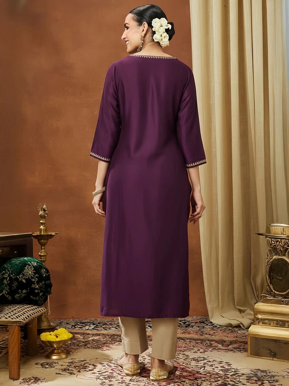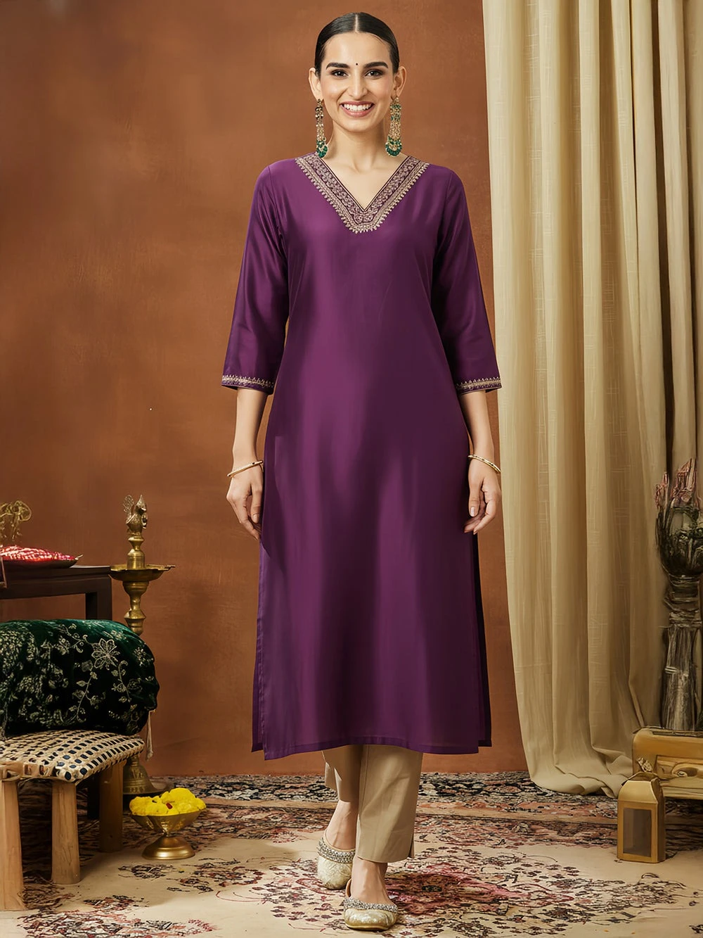 Add a touch of understated grace to your wardrobe with this wine straight kurta from janasya, crafted from rich chanderi fabric for a luxurious sheen. The kurta features a v-neckline adorned with delicate lace detailing, lending a refined and feminine touch to the silhouette. The three-quarter sleeves also feature matching lace at the hem, adding subtle elegance. Perfect for festive gatherings or evening outings, this kurta pairs beautifully with gold straight pants or beige palazzos for a complete look. Style it with statement jhumkas and gold bangles to elevate its charm and bring out the richness of the chanderi weave.
