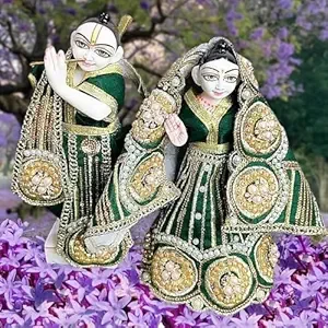 Our Radha Krishan Jodi Poshak Silk Shine Dress is a set of six elegantly crafted garments, perfect for celebrating the divine union of Radha and Krishna during Diwali Puja. It includes Patka, Dhoti, and Choli for Krishna, and Lehenga, Chunri, and Choli for Radha, each adorned with intricate designs and silk shine fabric.