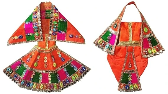Our Radha Krishan Jodi Poshak Silk Shine Dress is a set of six elegantly crafted garments, perfect for celebrating the divine union of Radha and Krishna during Diwali Puja. It includes Patka, Dhoti, and Choli for Krishna, and Lehenga, Chunri, and Choli for Radha, each adorned with intricate designs and silk shine fabric.