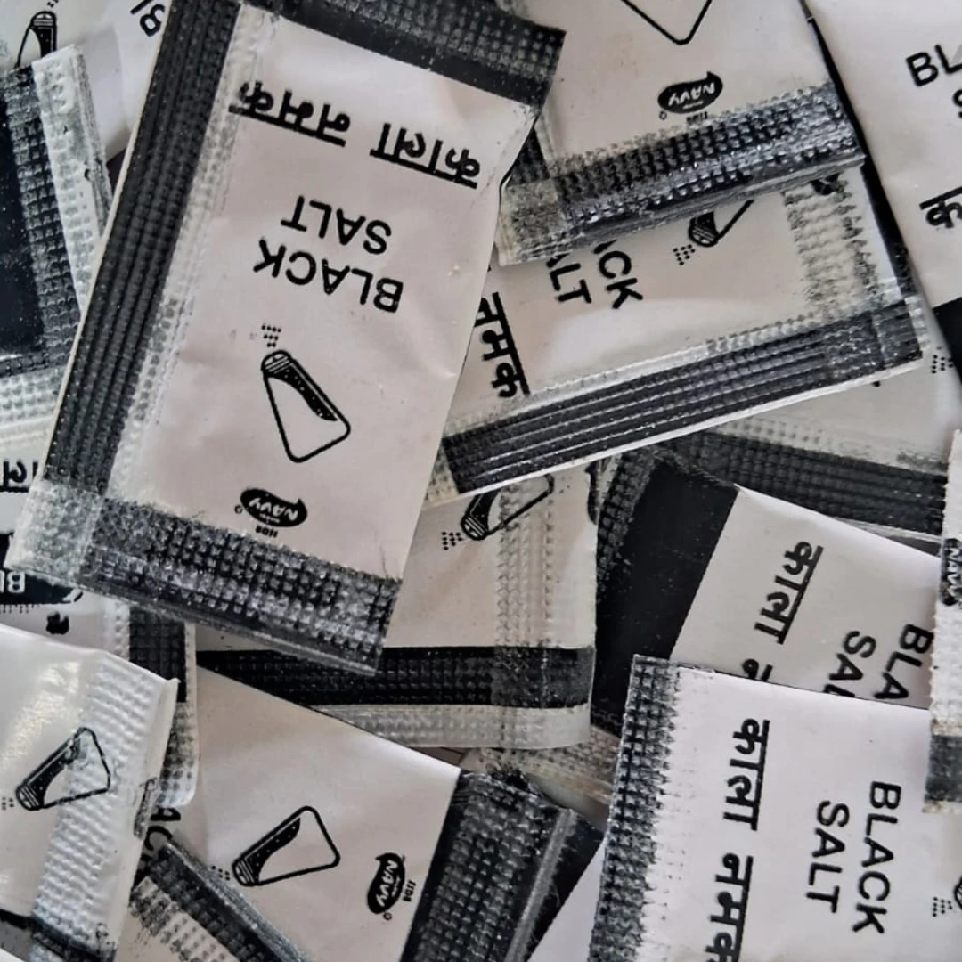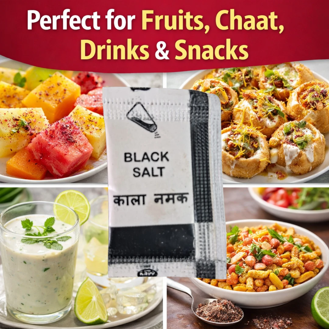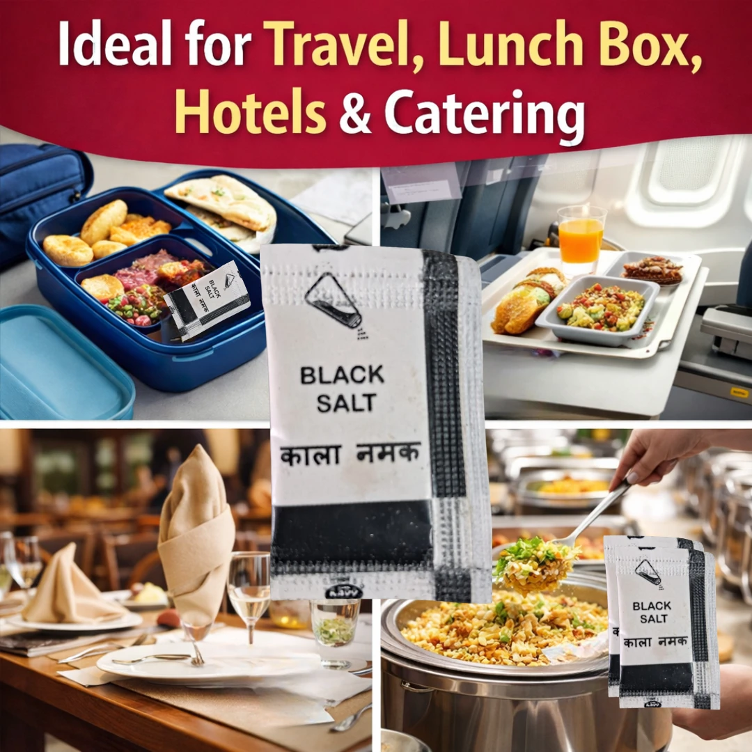 Black salt sachets are perfect for chaats, fruits, salads, and snacks, while iodized salt sachets are ideal for daily meals, soups, rice, and vegetables.