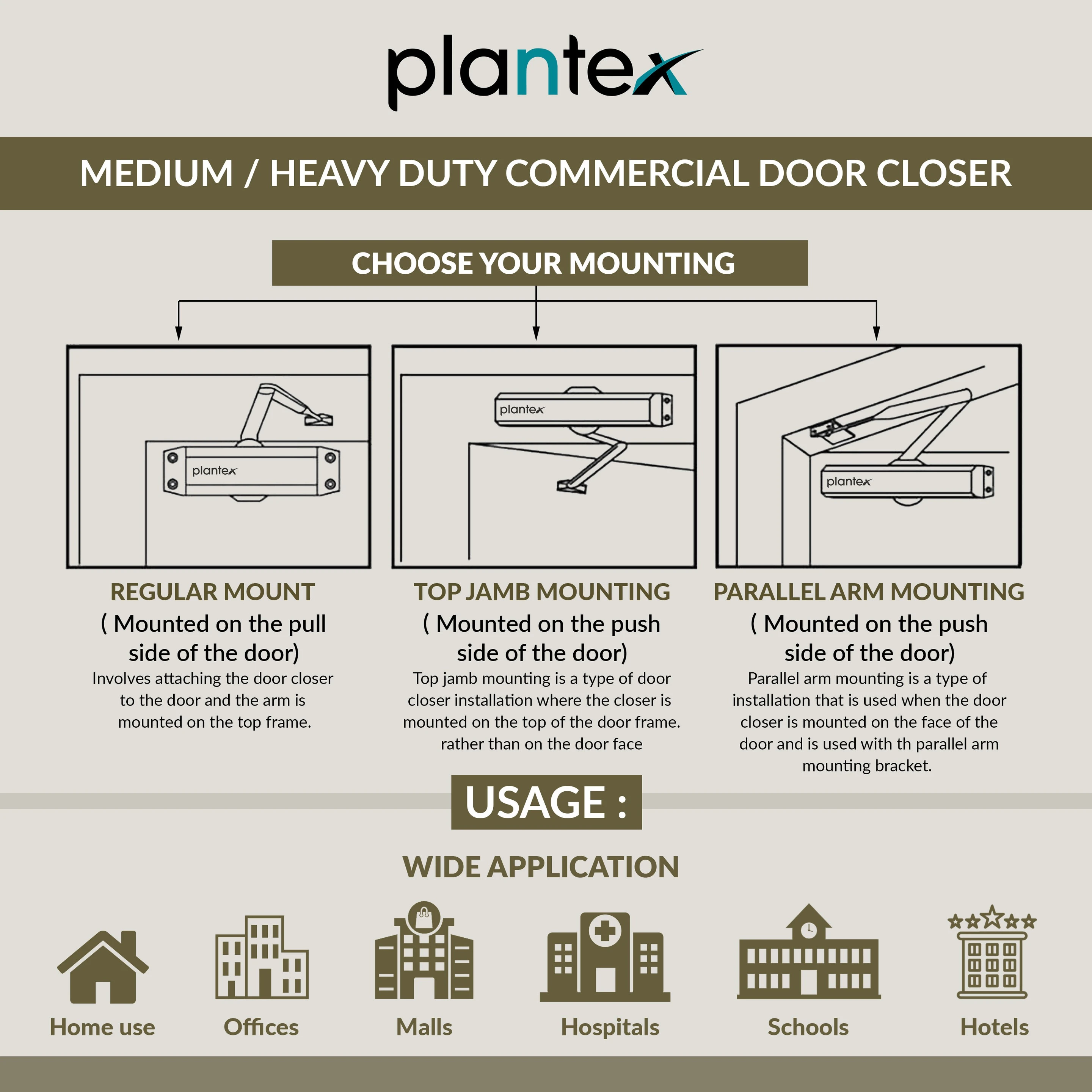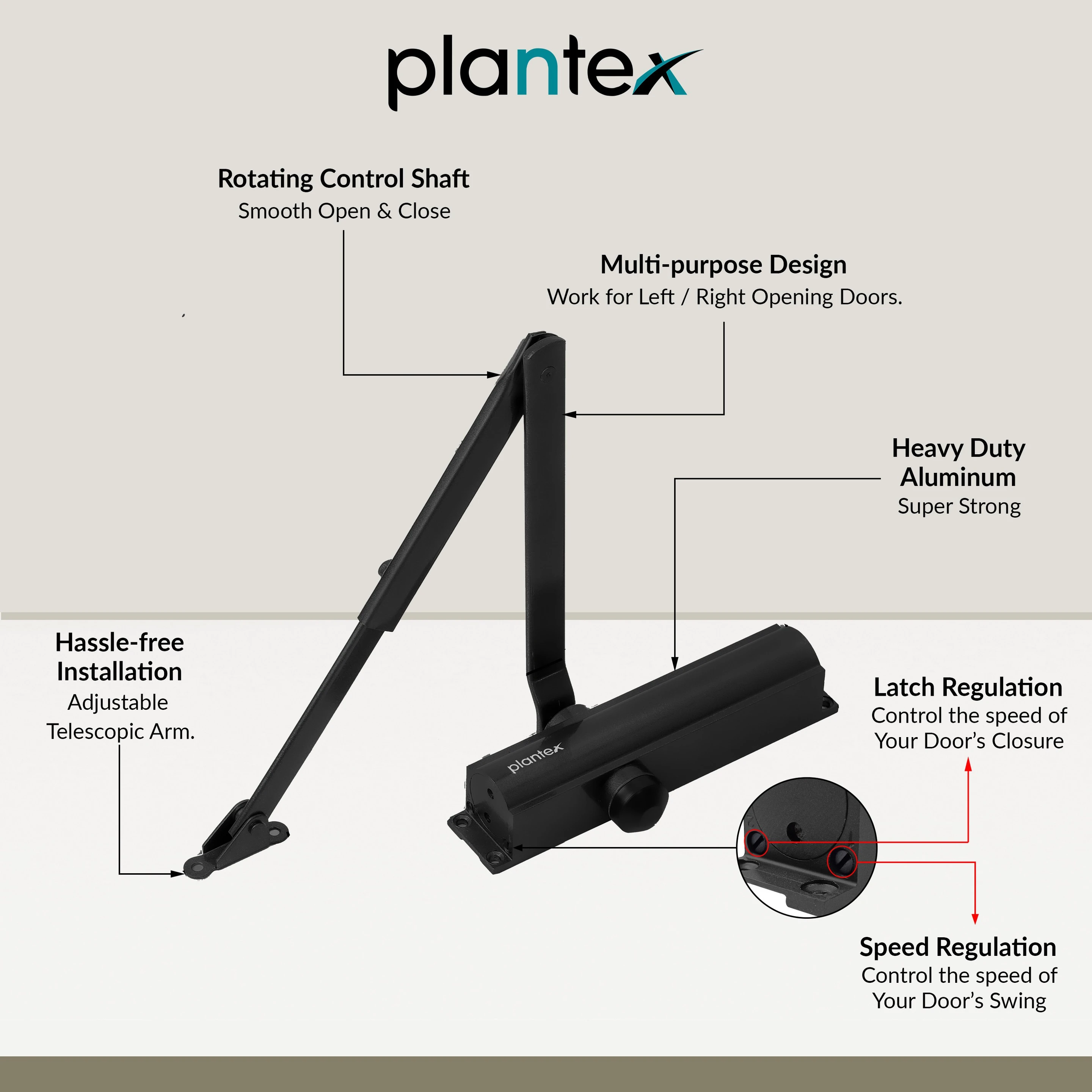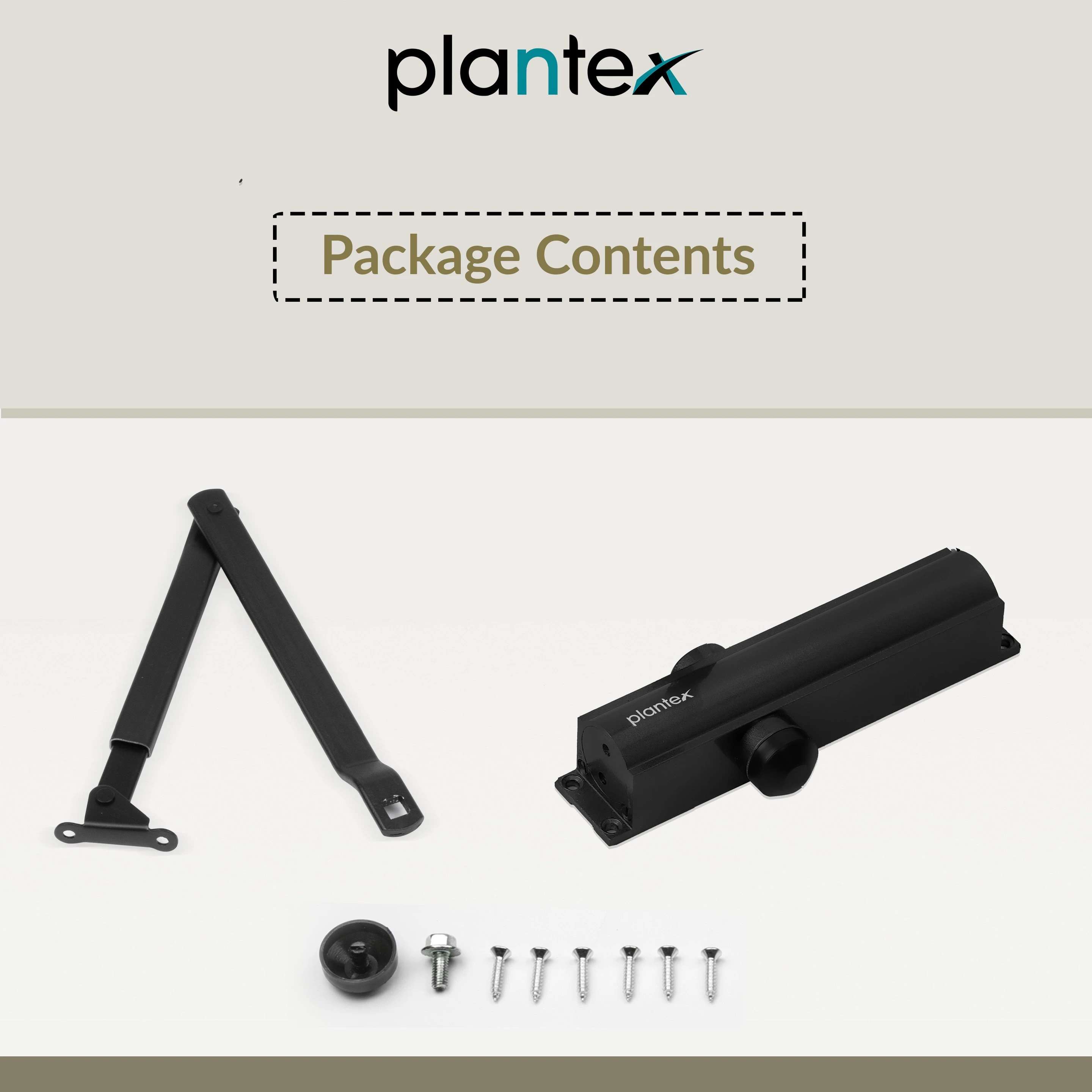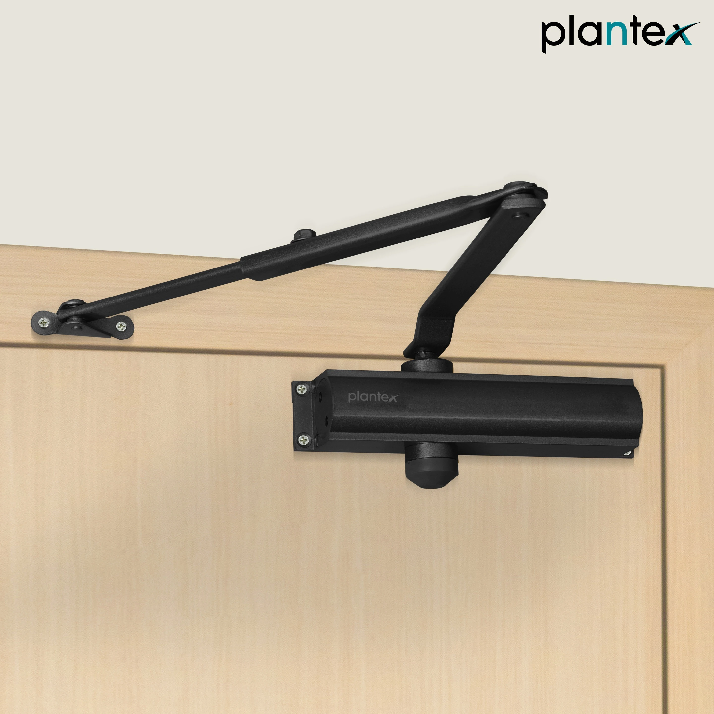 The Plantex Hydraulic Door Closer: Aluminum extrusion with a metallic finish, it is sleek and durable. It can support doors weighing up to 55 Kg and opens up to 180 Degrees with a compact design and a mechanism body size of 20 cm. It is ISO 9001 certified, ensuring that it meets international standards of quality and reliability. The package includes one mechanism body, one arm, and fixing screws for easy installation.