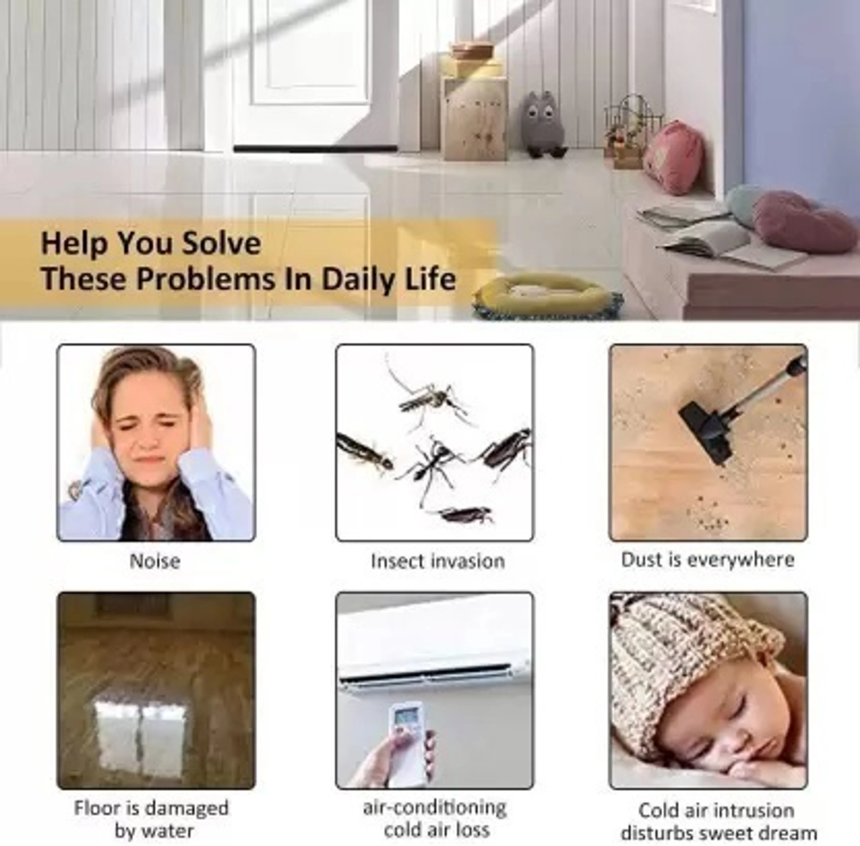 Door Seal Guard Twin Draught Guard The twin door draught stopper keeps the cold air staying out, the heat staying in with both-sided protection. The draught guard has been designed to snuggly hug doors and windows so that you're protected from draughts from both sides. Also great for blocking noise and fumes. The door draught stopper easily moves with the door and glides over carpet, wood, tile, linoleum. No need to bend down and reposition. Easily remove. Have you met this kind of problems? 1. air condition can't keep your room cold or warm 2. Always have dust on your surface. 3.Your floor usually gets soaked after winding and raining This is the reason we need these under door seals . With this door seal, you can say goodbye to these situations. After installing on the door, it is very tight to keep warm and cold air out of the room, block out the smell, block out the light,to create a comfortable environment.
