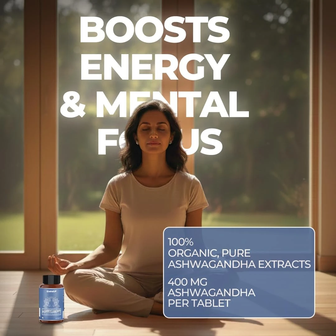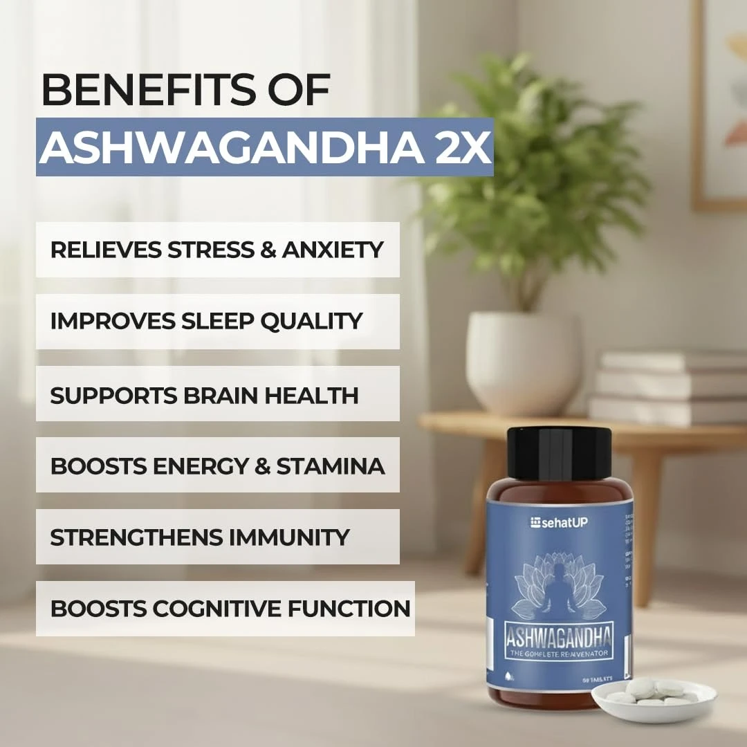 Manages Stress Levels & Boosts Brain Function: sehatUP Ashwagandha is clinically proven to reduce cortisol levels (stress hormone) and enhance cognitive function, focus, and memory retention. It helps calm the nervous system and promote deep, restorative sleep. It also helps in preventing age-related cognitive decline.