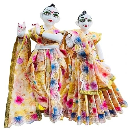 Our Radha Krishan Jodi Poshak Silk Shine Dress is a set of six elegantly crafted garments, perfect for celebrating the divine union of Radha and Krishna during Diwali Puja. It includes Patka, Dhoti, and Choli for Krishna, and Lehenga, Chunri, and Choli for Radha, each adorned with intricate designs and silk shine fabric.