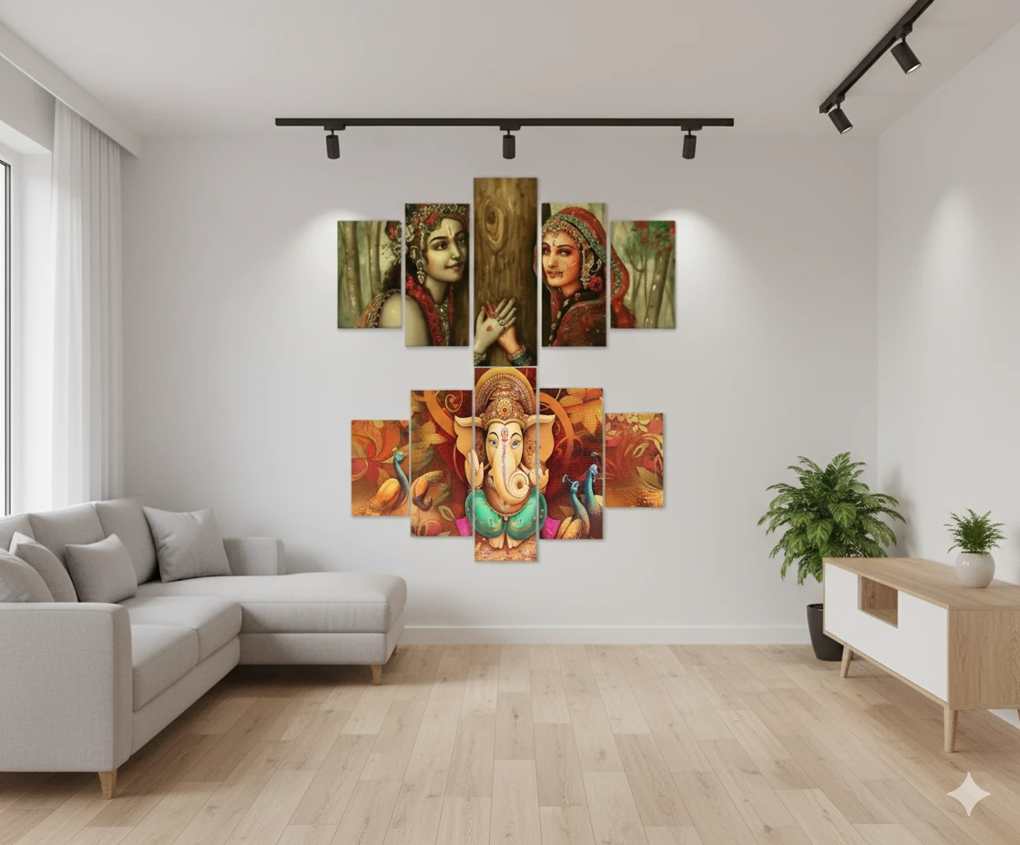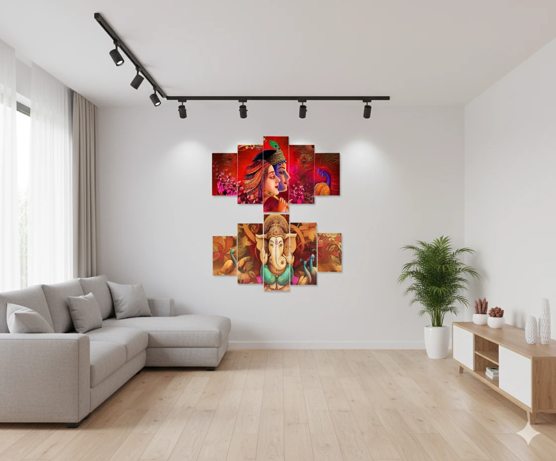 Radha Krishna Wall Art Set, 5 Panel Canvas Painting, Red and Gold, Decorative Peacock Theme