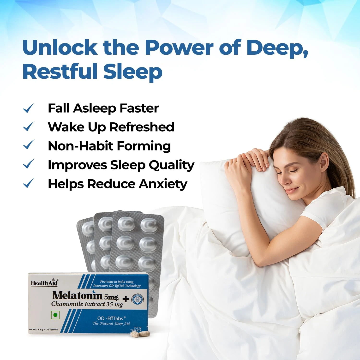 Unlock the secret to deep, restorative sleep with HealthAid's Melatonin and Chamomile sleep supplement. Embrace the powerful combination of melatonin and chamomile, two sleep enhancers that promote relaxation and enhance deep sleep quality. Our sleep health supplements for women and men are scientifically designed to help you drift off quickly and enjoy uninterrupted restful sleep, so you wake up feeling rejuvenated and full of energy.