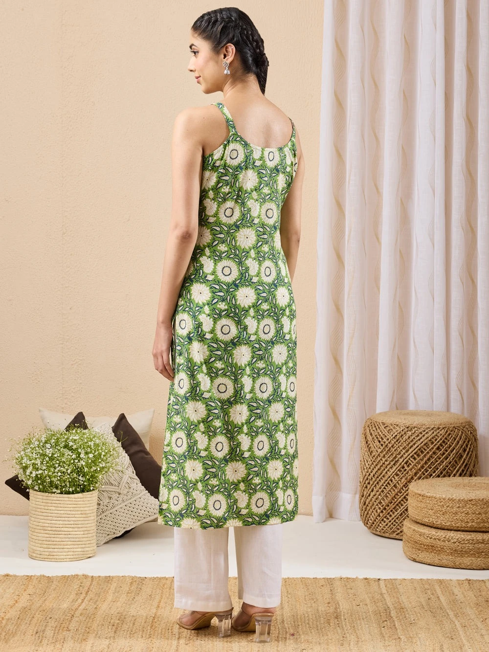 Add a fresh pop of colour to your wardrobe with this green printed cotton kurta from janasya. Designed with a flattering sleeveless silhouette and a graceful scoop neckline, it features delicate shell embellishments on the straps for a subtle handcrafted touch. The all-over floral print offers timeless appeal, while the breathable fabric ensures all-day comfort. Comes with a matching scrunchie for a coordinated look. Style it with off-white pants, flats and minimal jewellery for an effortless daytime outfit.