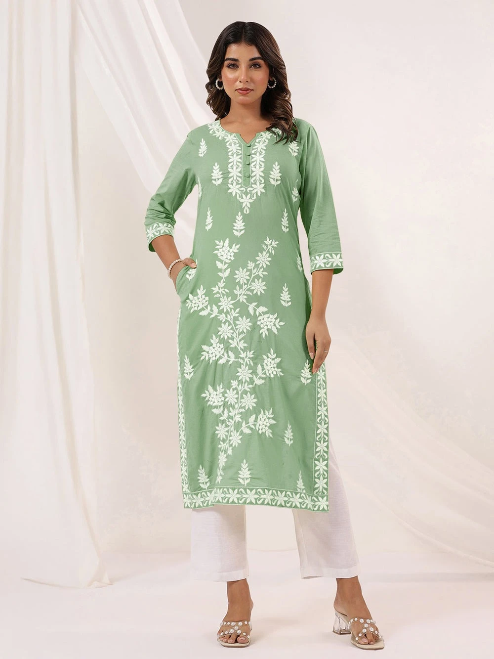 Step into effortless elegance with this pure cotton green kurta, designed for both style and comfort. The notch neckline is complemented by a buttoned yoke. The yoke is beautifully embroidered, with delicate threadwork flowing all over the kurta. Fine embroidery on the sleeve hems adds a charming finish, while the functional side pocket brings practicality to your everyday wear. Light, breathable, and beautifully detailed — this piece is perfect for summer days, work settings, or serene gatherings.