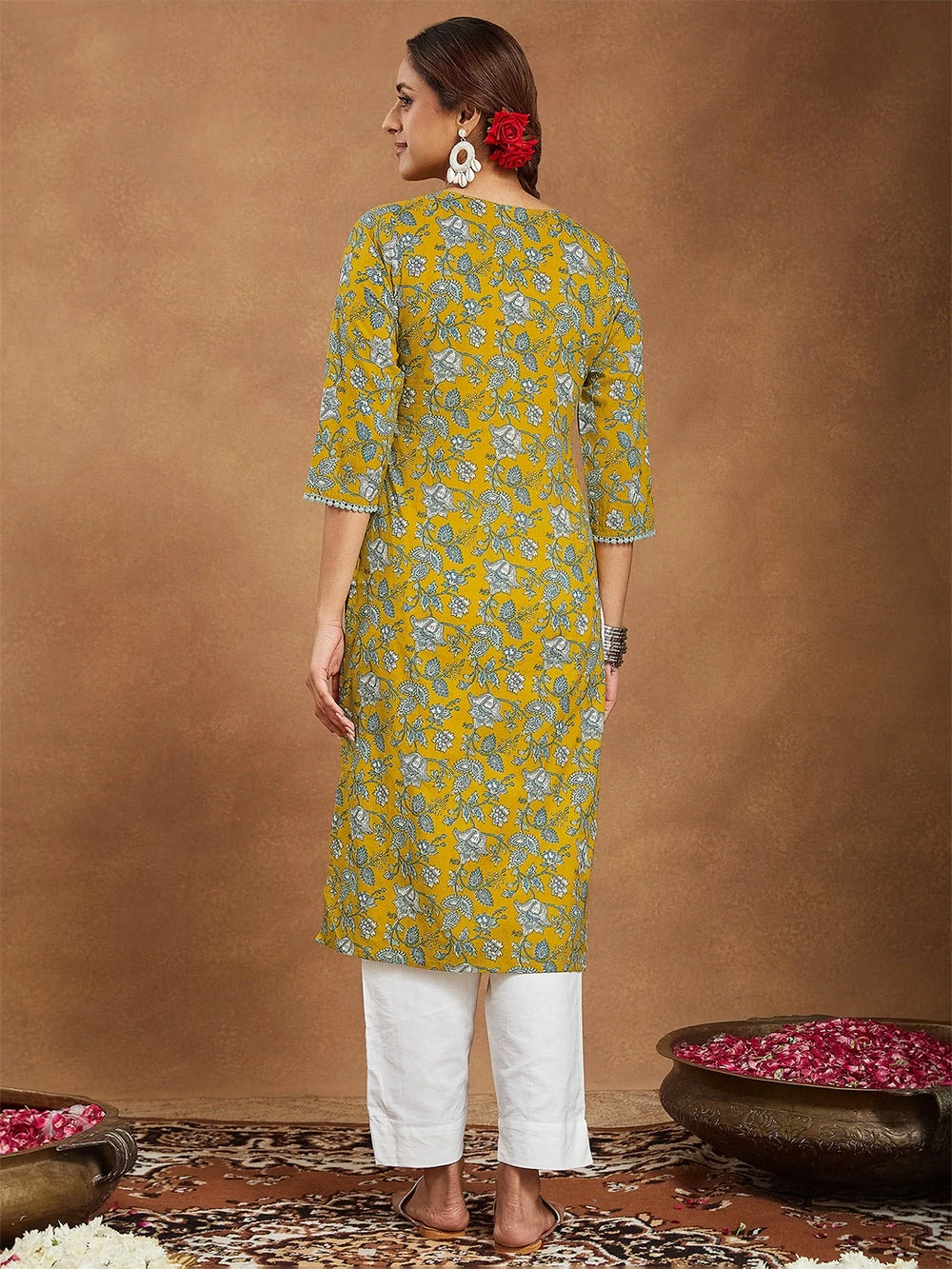 Brighten your everyday style with this mustard pure cotton straight kurta from janasya. Adorned with a lively floral print, it brings a touch of elegance and vibrance to both casual outings and office wear. The notch neckline is enhanced with delicate cotton lace detailing, echoed along the front placket for a graceful finish. Designed with three-quarter sleeves adorned with cotton lace and a straight silhouette, it offers both comfort and versatility. Pair it with white or beige pants for a breezy summer look or style with oxidized silver jhumkas and kolhapuris for festive charm. Add a solid organza dupatta for refined elegance.