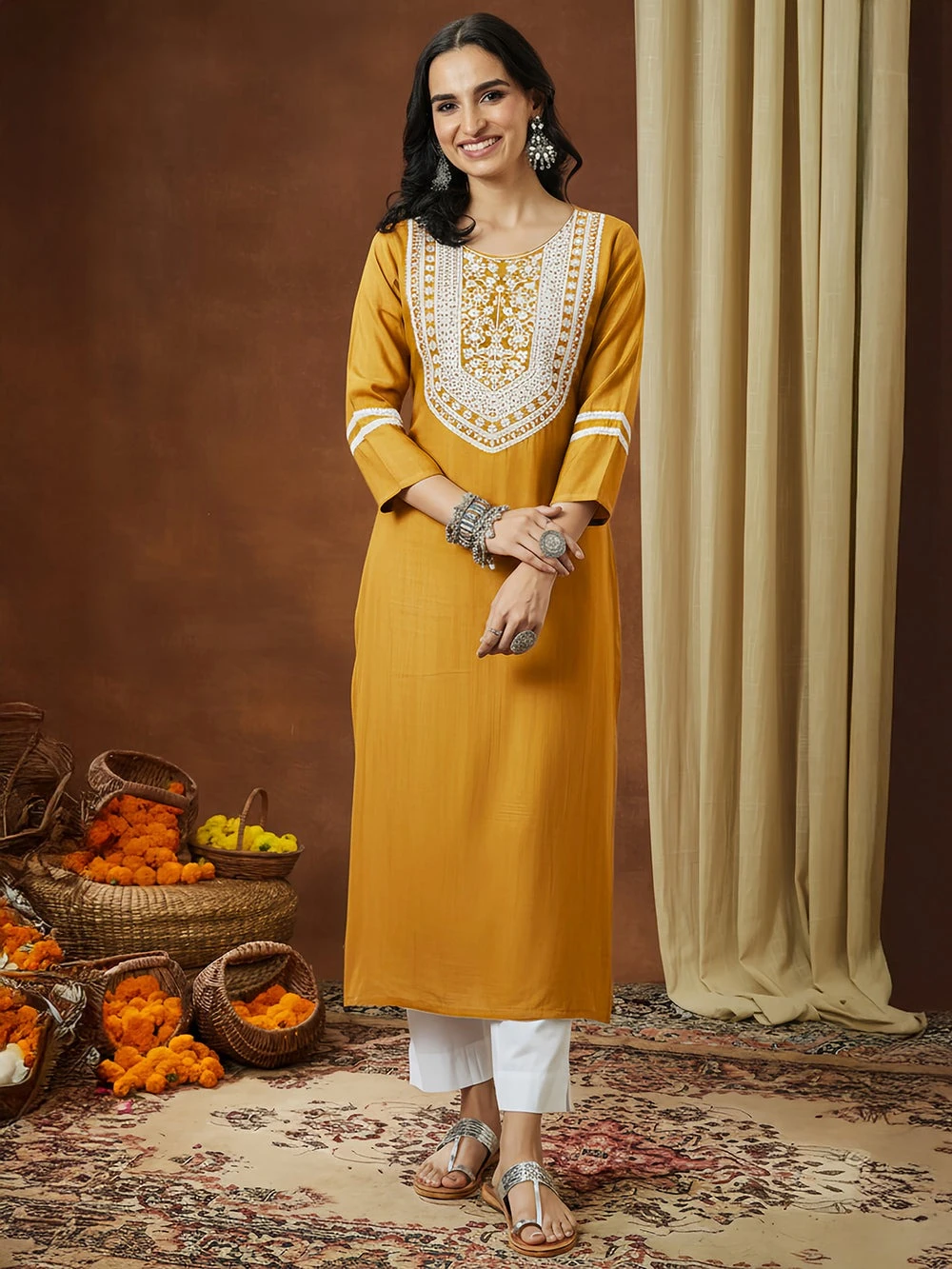 Elevate your ethnic wardrobe with this exquisite mustard straight kurta from janasya, crafted in a luxurious silk blend fabric. The kurta features a classic round neckline adorned with intricate white dori embroidery, accentuated with hints of zari and sequins for subtle shimmer. The embroidery forms a beautifully detailed yoke with mirror work and is bordered delicately with white lace, adding an elegant contrast. The three-quarter sleeves are enhanced with white lace bands placed above the elbow and at the hem, lending a balanced and refined appeal to the overall design. Perfect for festive gatherings or intimate celebrations, this kurta pairs effortlessly with white palazzos or straight pants for a timeless monochrome look. Style it with oxidized silver jhumkas, chunky bangles, and a statement ring to complete the ensemble. Opt for silver kolhapuris or embroidered flats to add the final ethnic flourish.