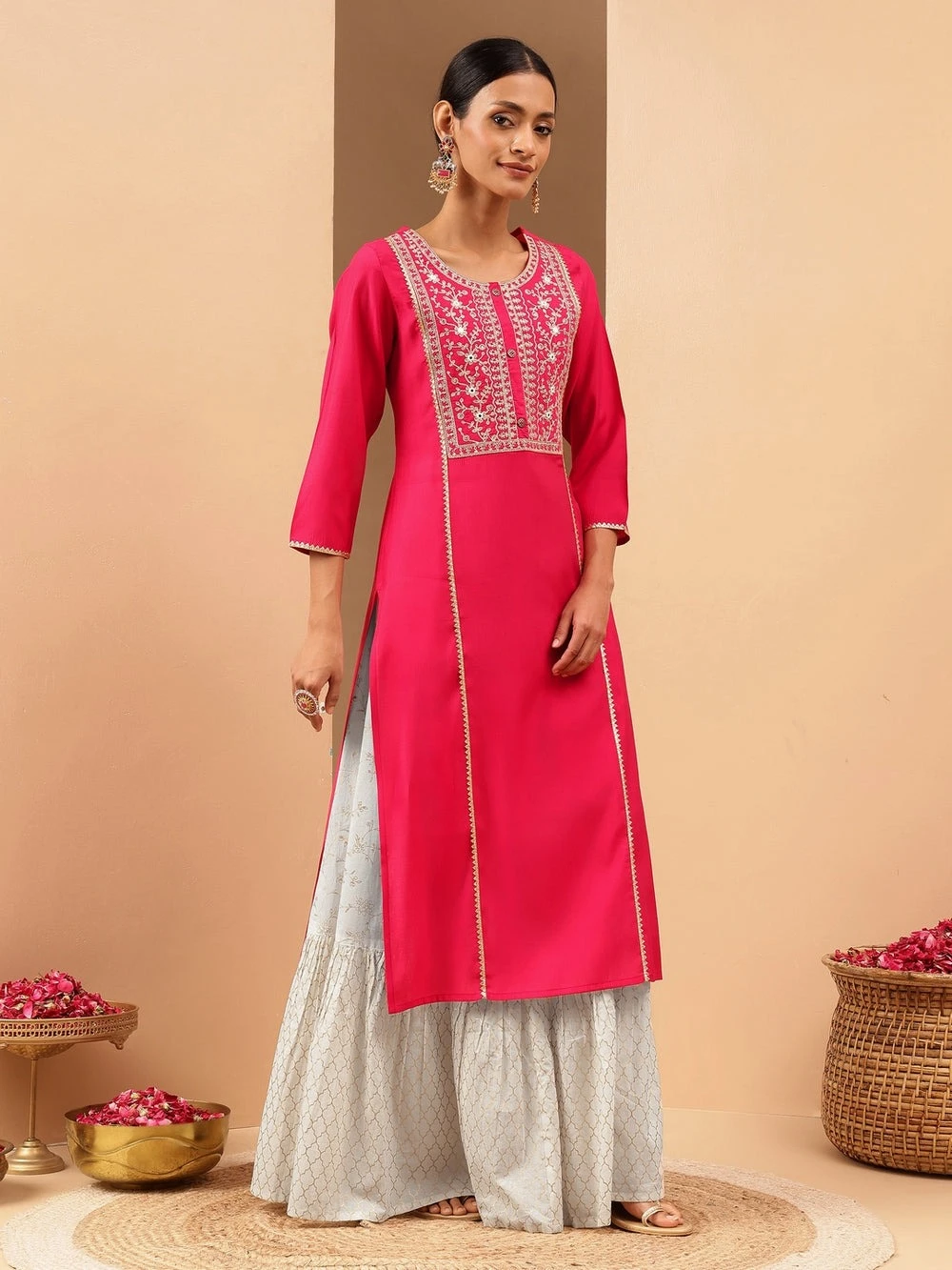 Elevate your festive wardrobe with this vibrant pink straight kurta from Janasya. Crafted in rich chanderi fabric, the kurta features an intricately embroidered yoke patch with elegant dori work and subtle mirror embellishments, adding a refined sparkle to the ensemble. Metallic buttons at the front lend a contemporary touch, while the round neckline with a slight scoop enhances its classic appeal. The golden lace detailing down the princess line and sleeve hem adds a luxurious finish, making it perfect for special occasions. The kurta has a flattering straight silhouette with three-quarter sleeves that strike the right balance of comfort and style. Pair this kurta with a flared white sharara or palazzos for a striking contrast. Complete the look with traditional jhumkas, embroidered juttis, and a sleek bun adorned with fresh gajra.