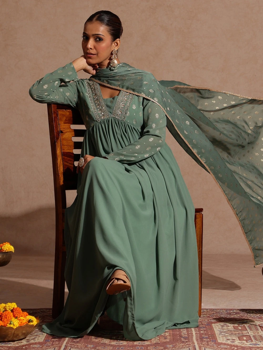 Make a statement at any festive gathering with this stunning sage green a-line kurta and dupatta set from Janasya. Crafted in weightless georgette, the floor-length a-line silhouette features delicate gathers and butter crepe lining for a graceful flow. The yoke is adorned with intricate golden zari work and shimmering foil prints, adding a festive sparkle. Designed with a flattering v-neckline and full sleeves with button closure, it offers both comfort and sophistication. The outfit is paired with a matching chiffon sage green dupatta, adorned with golden foil prints and finished with an elegant gota patti border. Perfect for festive occasions, weddings, and celebrations, this ensemble blends timeless tradition with contemporary charm.