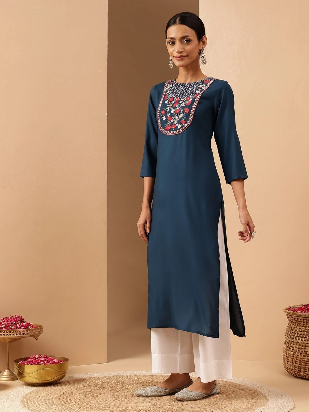 Elevate your everyday ethnic wardrobe with this elegant teal straight kurta from janasya. Crafted in soft rayon fabric, the kurta features exquisite multicolor floral embroidery in a contrast thread, intricately placed on a rounded patch at the yoke. This patch embroidery adds a bold yet graceful focal point to the design. The kurta showcases a round neckline, complemented by three-quarter sleeves for a balanced, modest silhouette. Perfect for work, casual outings, or light festive occasions, the kurta’s clean structure is elevated by its artistic surface styling. Style this piece with white palazzo pants or cigarette trousers, silver jhumkas, and embroidered juttis for a chic indo-fusion look. Whether you're heading to a family get-together or a festive luncheon, this kurta offers both style and comfort.