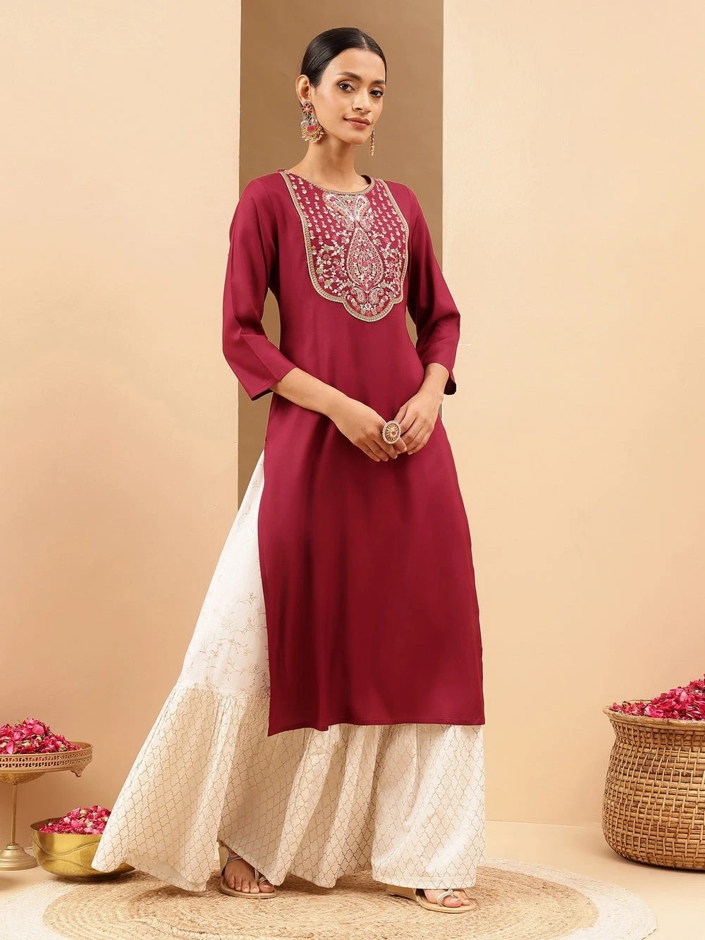 Add a regal touch to your festive wardrobe with this wine-colored straight kurta from janasya, crafted in soft and breathable rayon fabric. The kurta features intricate thread and zari embroidery on the front yoke, arranged in a beautiful symmetrical pattern, highlighted further with patch embroidery that lends a refined and traditional look. The round neckline adds a subtle look. Designed with three-quarter sleeves, the kurta offers both grace and comfort for long celebrations. Pair this flared palazzos, or a silk churidar for a festive-ready look. Elevate the outfit with statement jhumkas, gold kada, and mojris or heels for a truly graceful ensemble. Whether it's for diwali dinners or family gatherings, this kurta is sure to bring out your inner elegance.