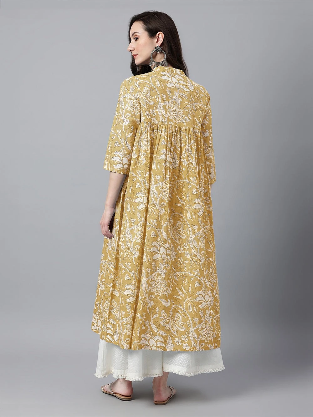 Brighten your wardrobe with janasya’s mustard floral-printed kurti, designed to blend comfort and chic effortlessly. Crafted from soft cotton, it boasts a flattering v-neckline with gathered detailing above the bust, creating a silhouette that’s both feminine and flattering. The 3/4 sleeves and flared cut add an airy, relaxed vibe. Pair with your favorite pants or palazzo for a fresh, bold look that’s perfect for a day out with friends!