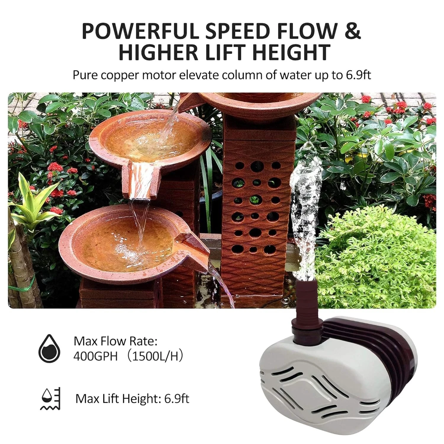 HIGH WATER LIFT & FLOW RATE - 18W Pump with 1.85m water lift and 800L/H water flow. Powerful submersible pump, which is perfect for large size gardens, aquarium, coolers, etc. Our Submersible pump max lift height: 6ft/1.85m.
