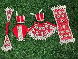 Our Radha Krishan Jodi Poshak Silk Shine Dress is a set of six elegantly crafted garments, perfect for celebrating the divine union of Radha and Krishna during Diwali Puja. It includes Patka, Dhoti, and Choli for Krishna, and Lehenga, Chunri, and Choli for Radha, each adorned with intricate designs and silk shine fabric.