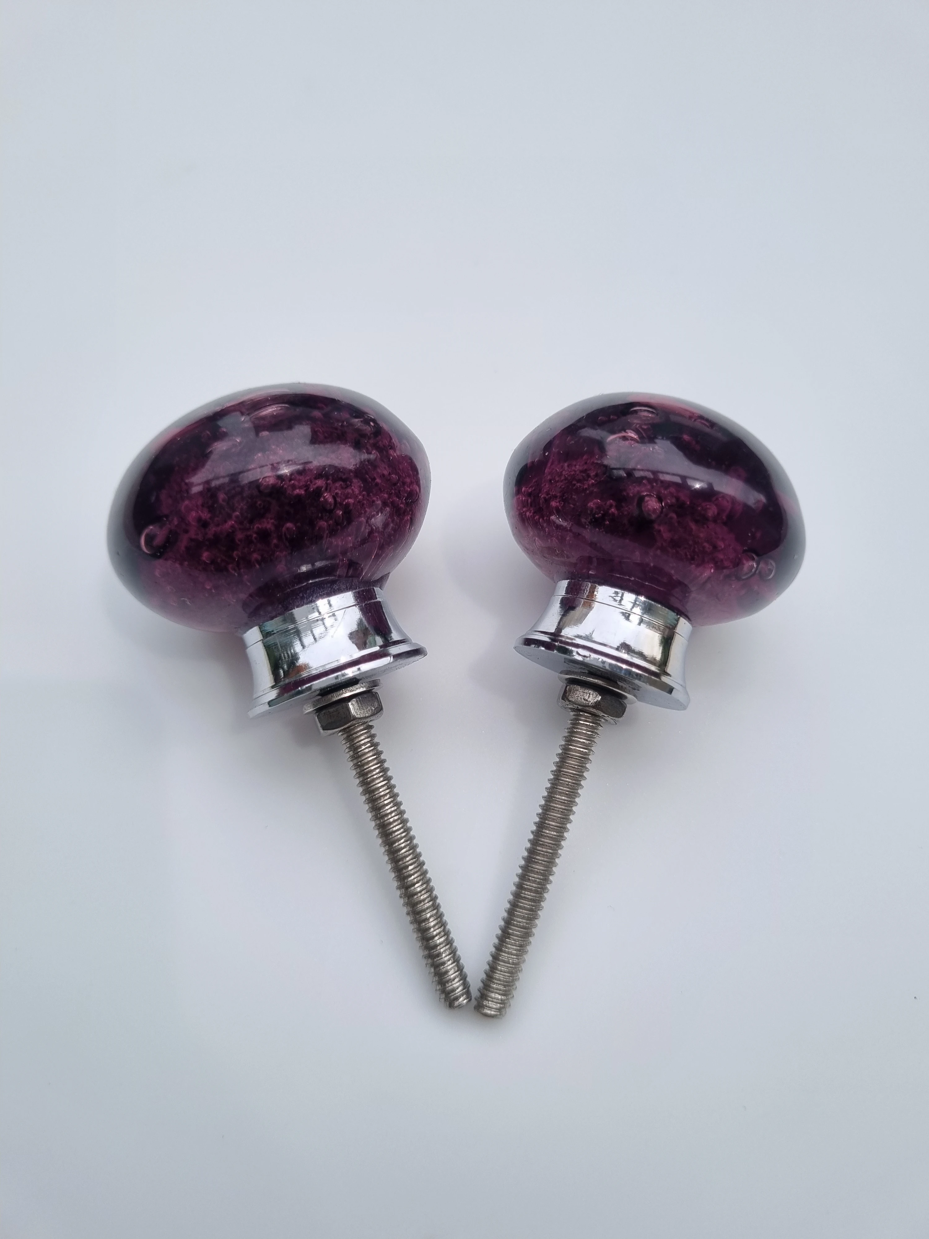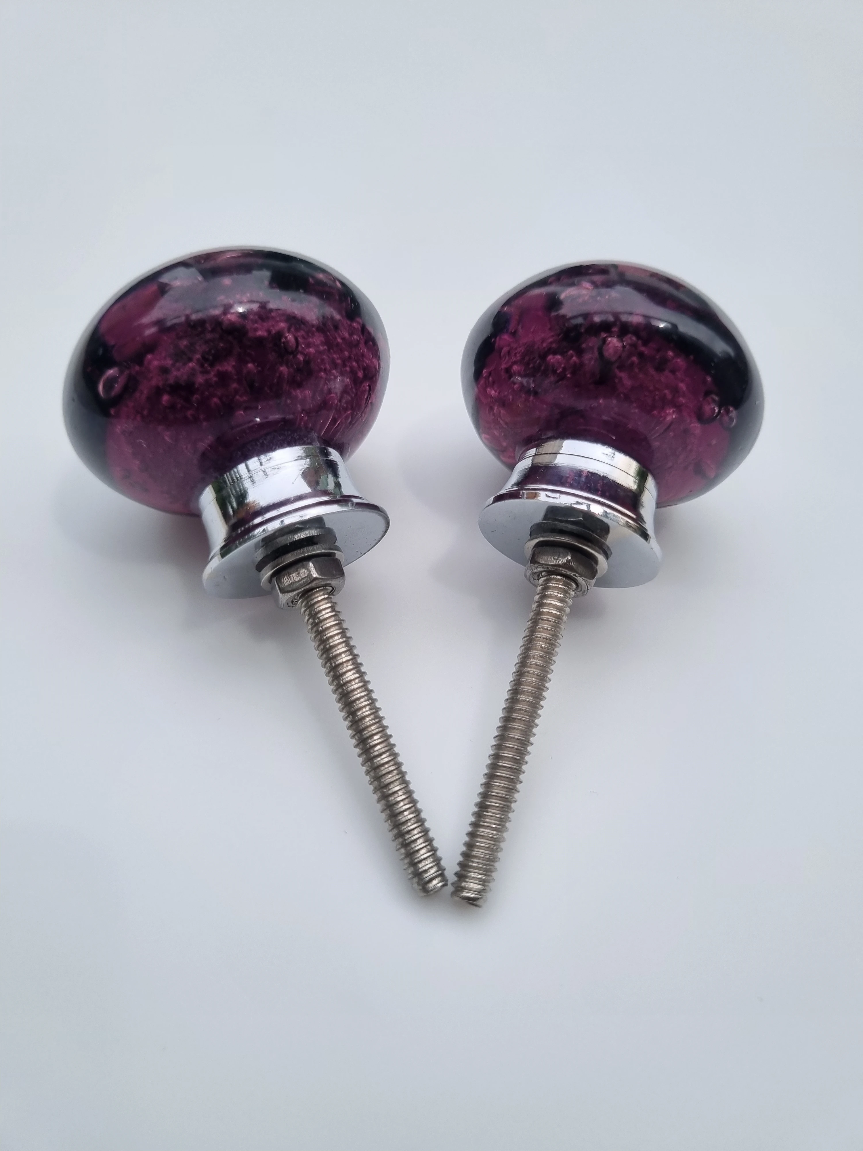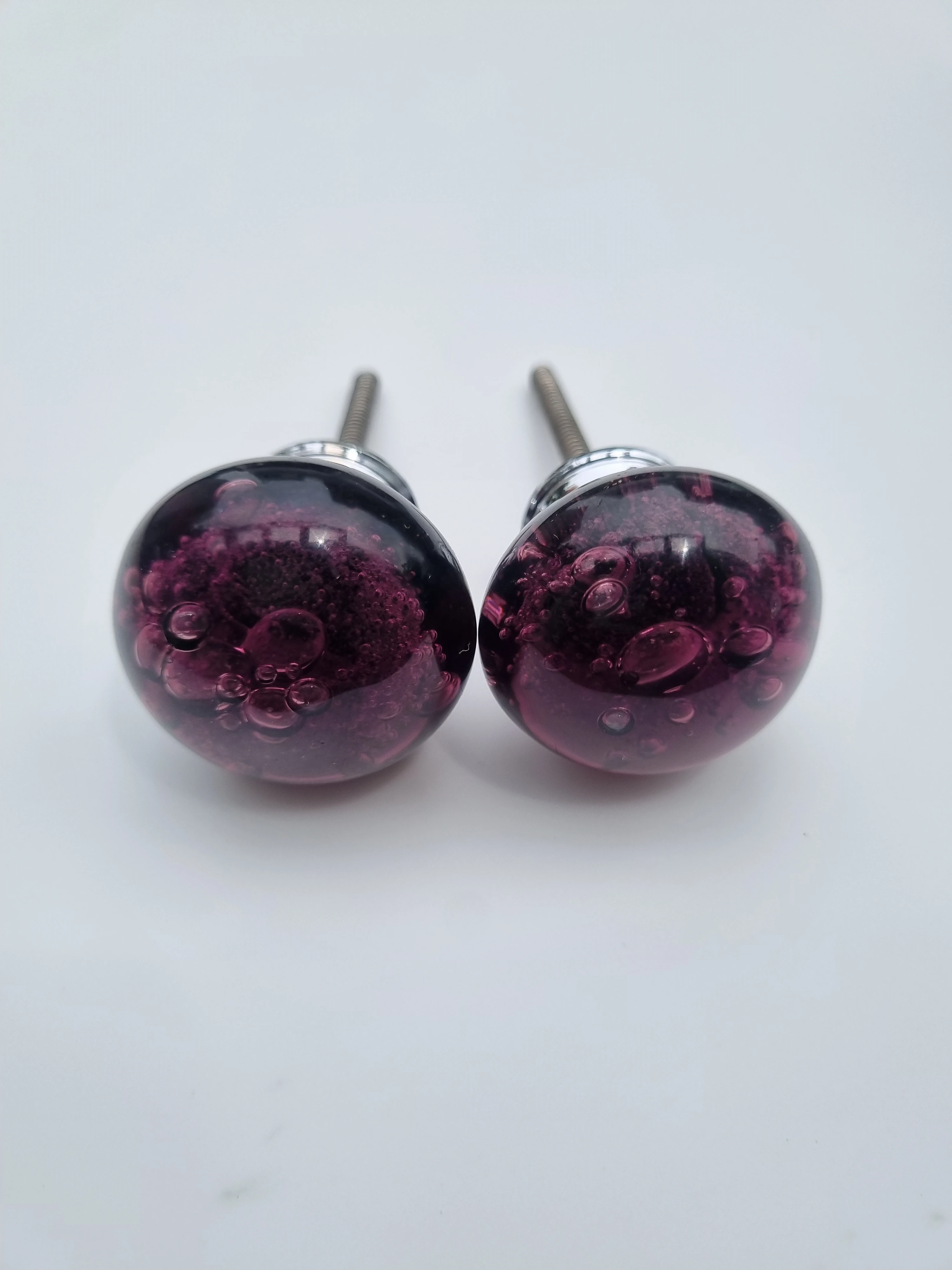 Elevate your furniture with these stunning decorative cabinet knobs. Crafted from translucent purple glass with a captivating bubble-textured design, each knob adds a vibrant pop of color and artistic flair to drawers or cabinet doors. The rounded shape pairs beautifully with a sleek metallic base and threaded screw for secure installation. Perfect for modern, eclectic, or vintage-inspired interiors, these knobs combine