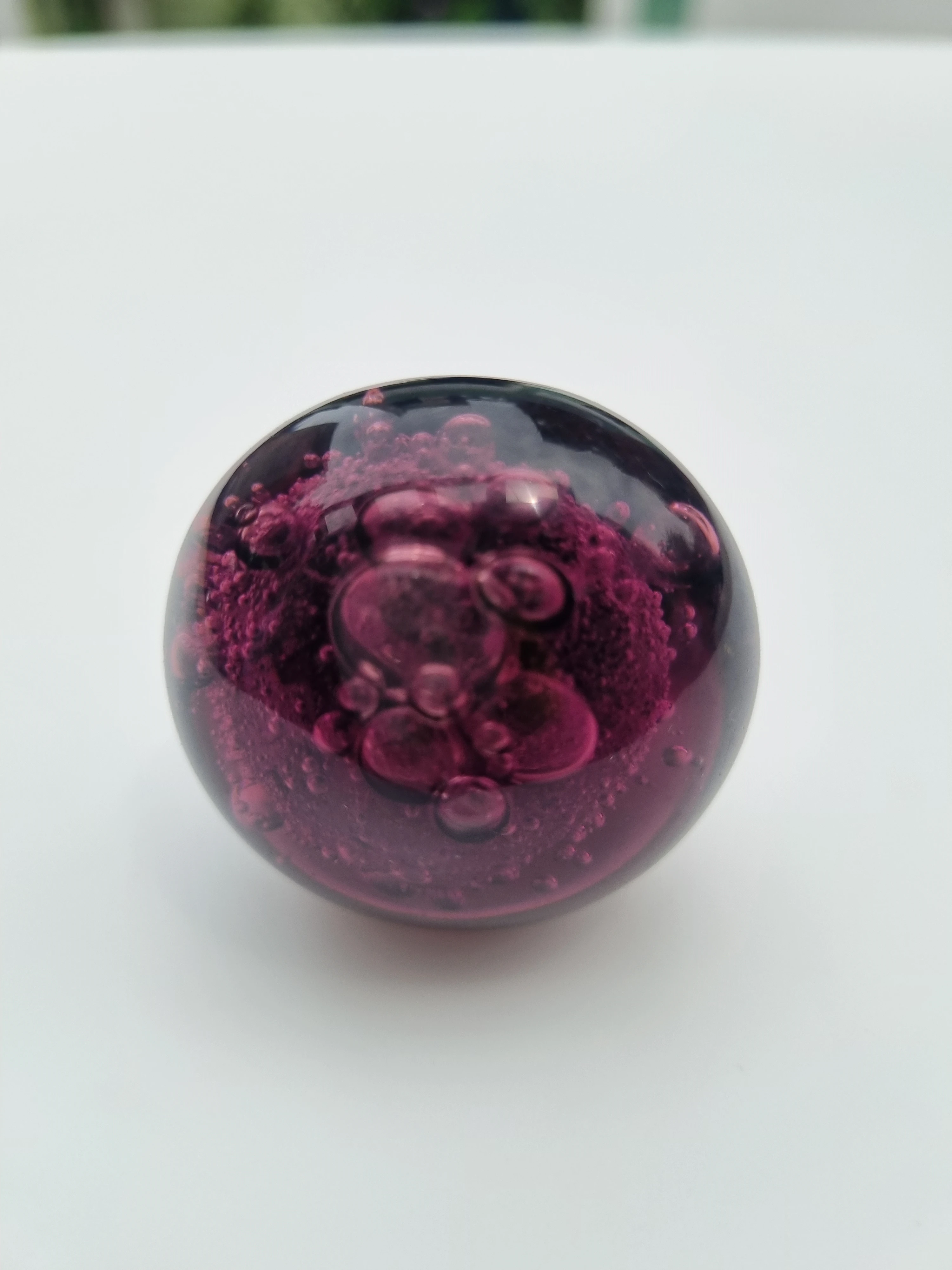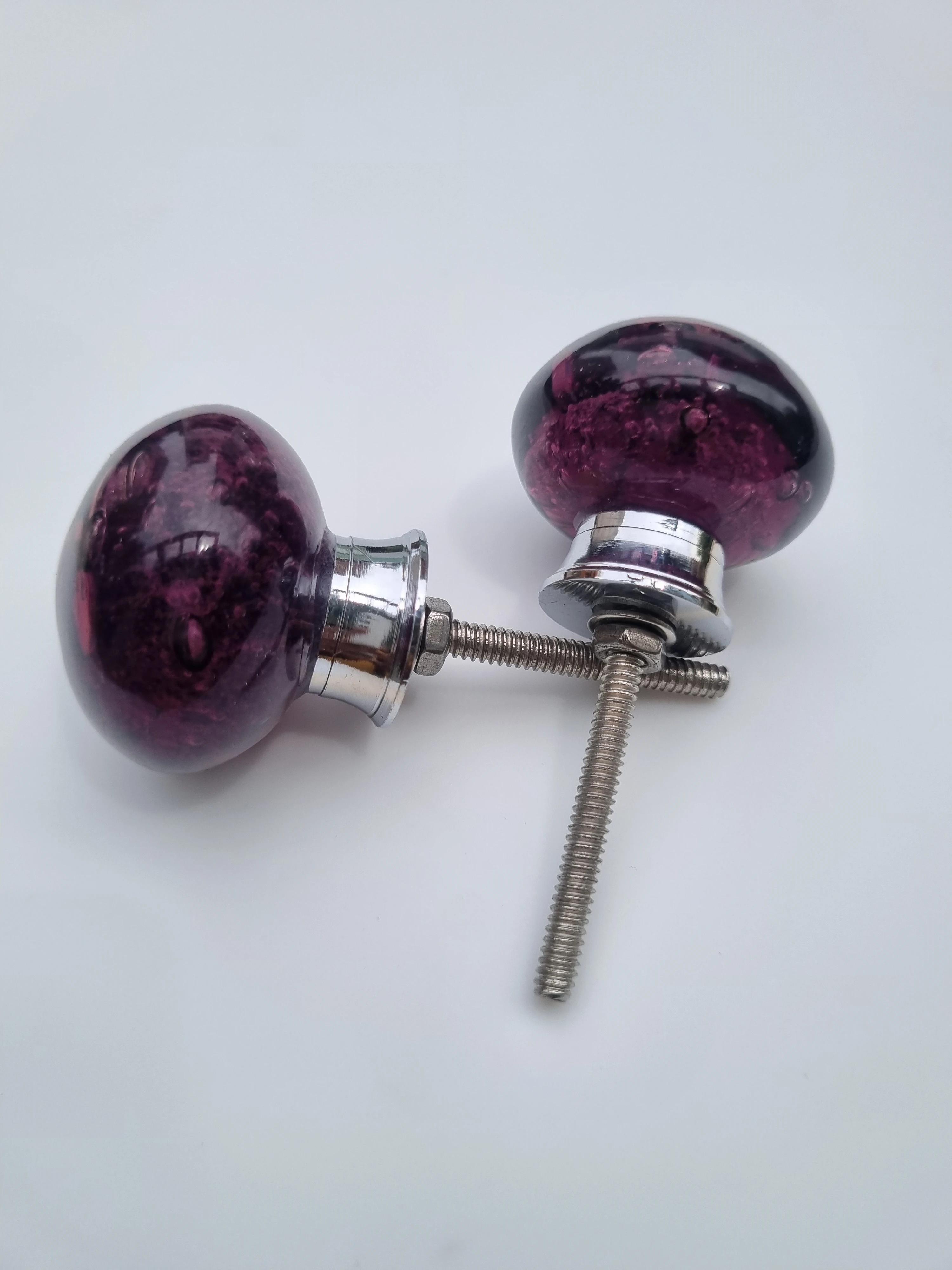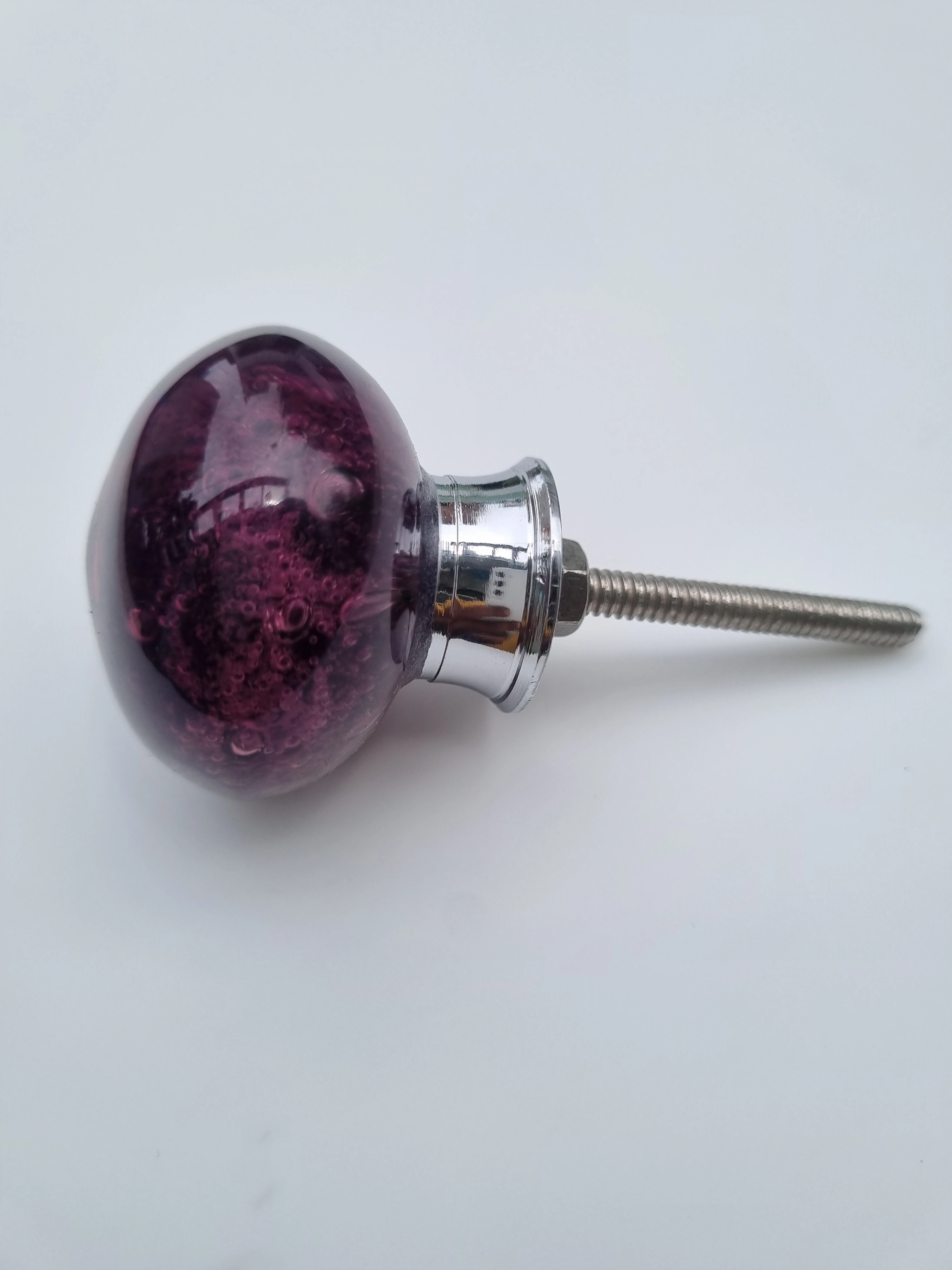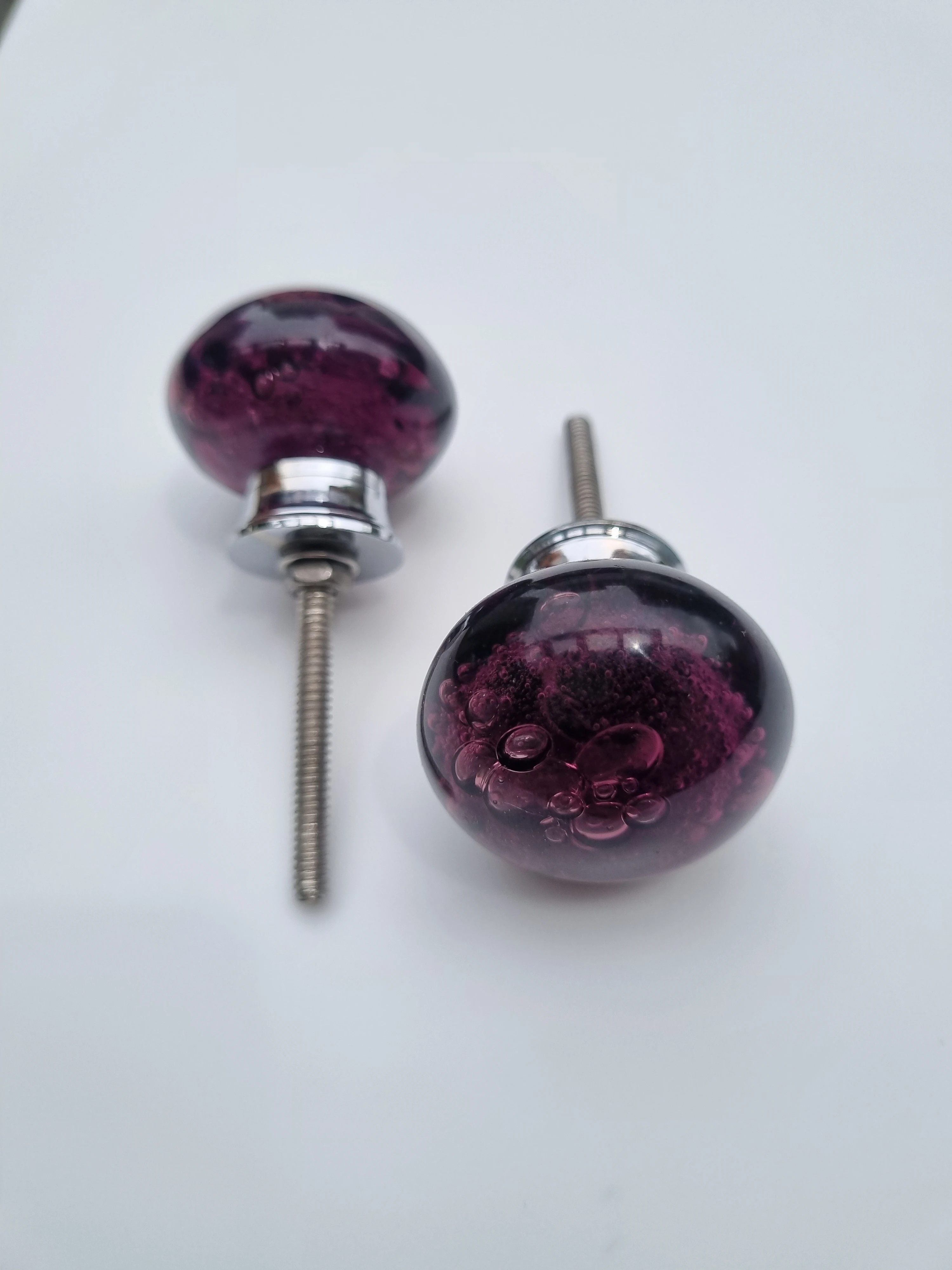 Elevate your furniture with these stunning decorative cabinet knobs. Crafted from translucent purple glass with a captivating bubble-textured design, each knob adds a vibrant pop of color and artistic flair to drawers or cabinet doors. The rounded shape pairs beautifully with a sleek metallic base and threaded screw for secure installation. Perfect for modern, eclectic, or vintage-inspired interiors, these knobs combine