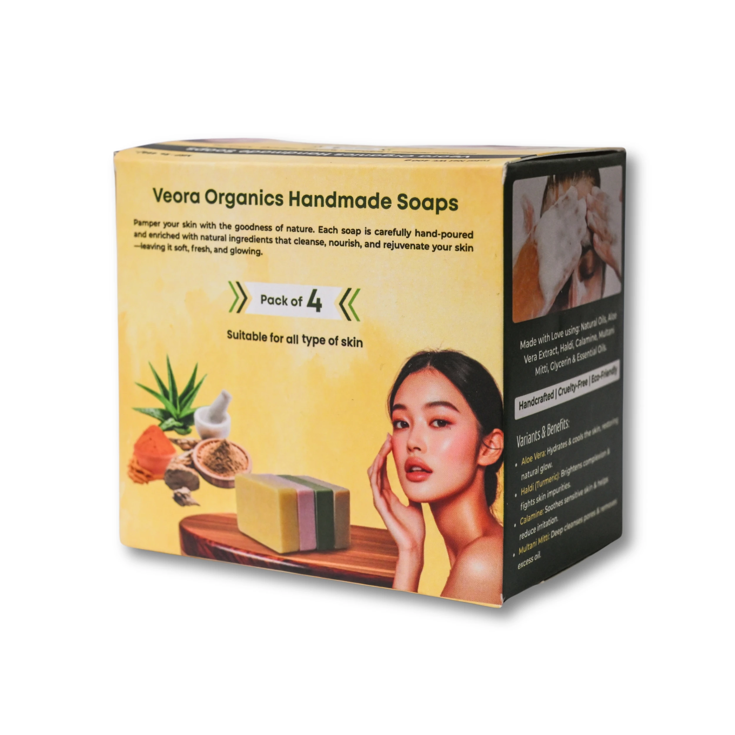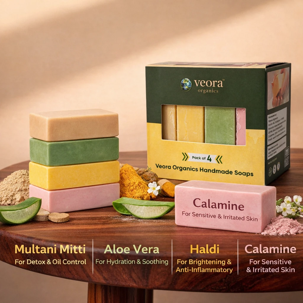 This combo features four skin-loving variants — Haldi, Calamine, Aloe Vera, and Multani Mitti, each designed to target specific skin needs while maintaining your skin’s natural moisture and glow.