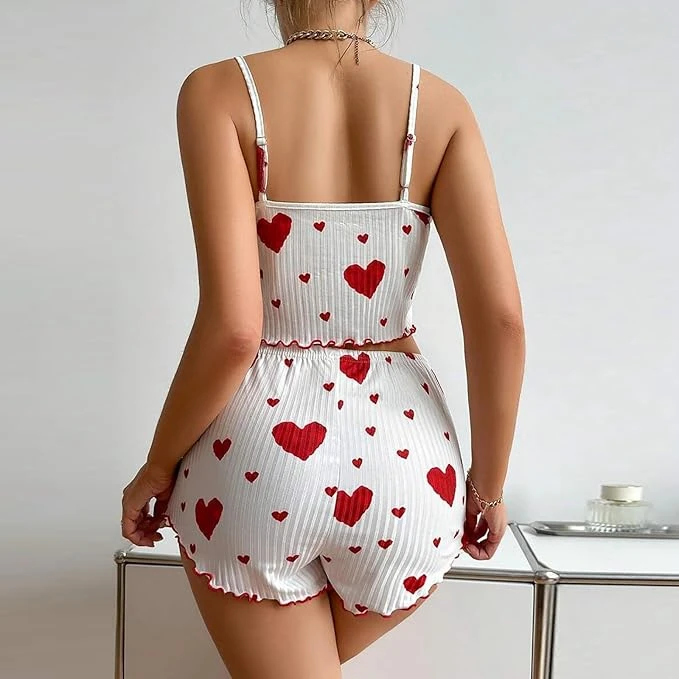 The set includes a ribbed Cami top with adjustable straps and matching shorts, both adorned with playful red hearts scattered across a crisp white background. The feminine ruffled hem detailing on both pieces adds a touch of sweetness to the overall look.